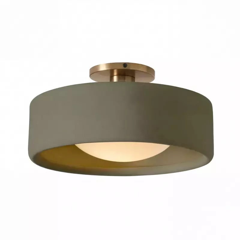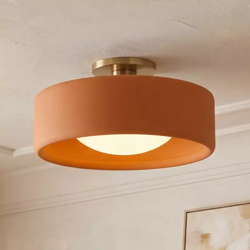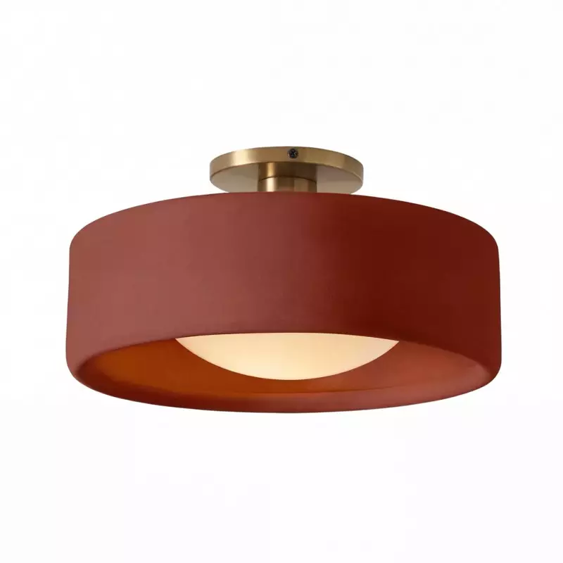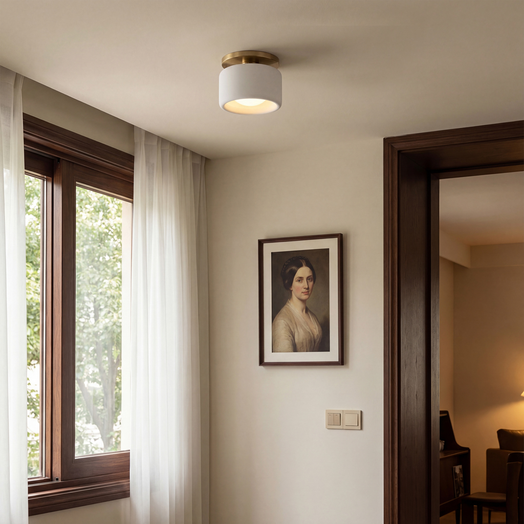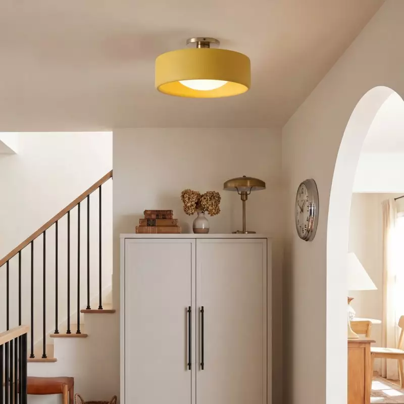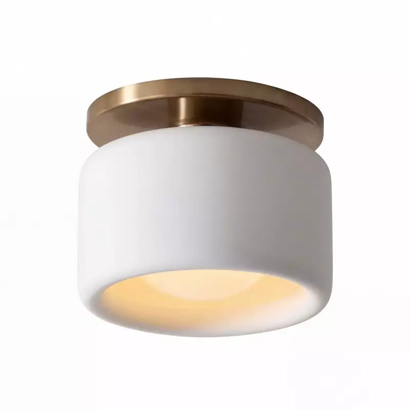 This minimalist porcelain flush mount ceiling light, characterized by its elegant white drum shade and a sophisticated brass-finished base, presents a contemporary ceiling light solution. Available in a variety of colors, it offers flexibility to match diverse interior designs. Whether as bedroom ceiling light fixtures or for illuminating hallways and living rooms, this semi flush mount lighting option seamlessly combines functionality with style.