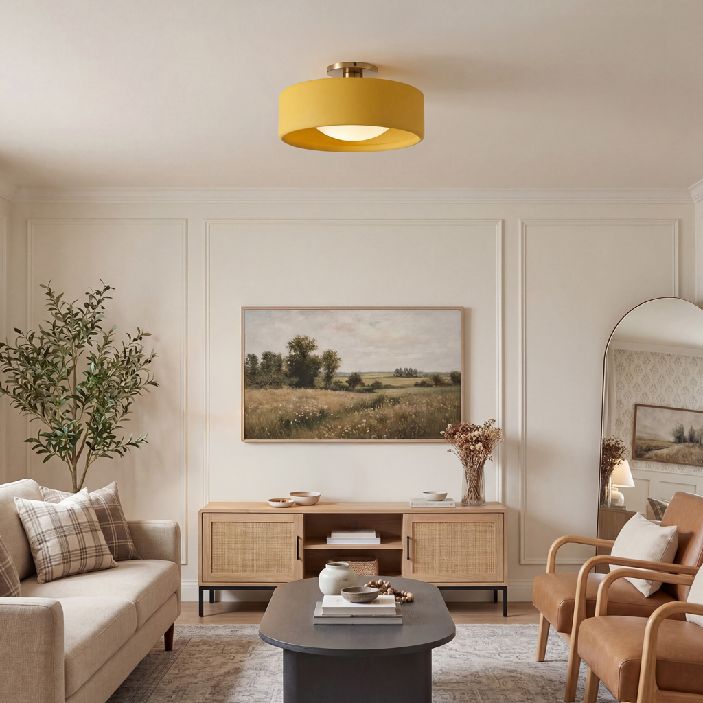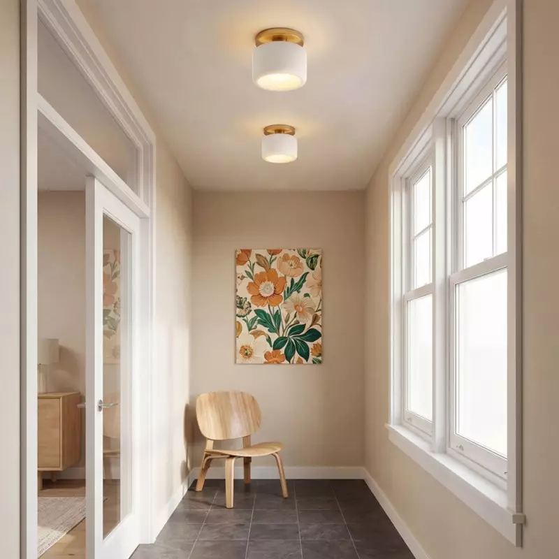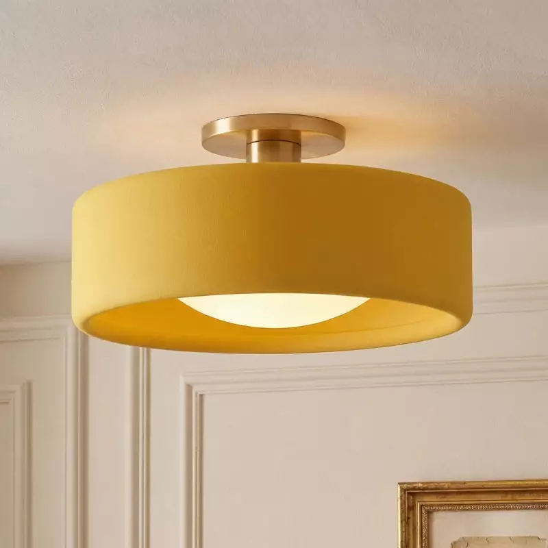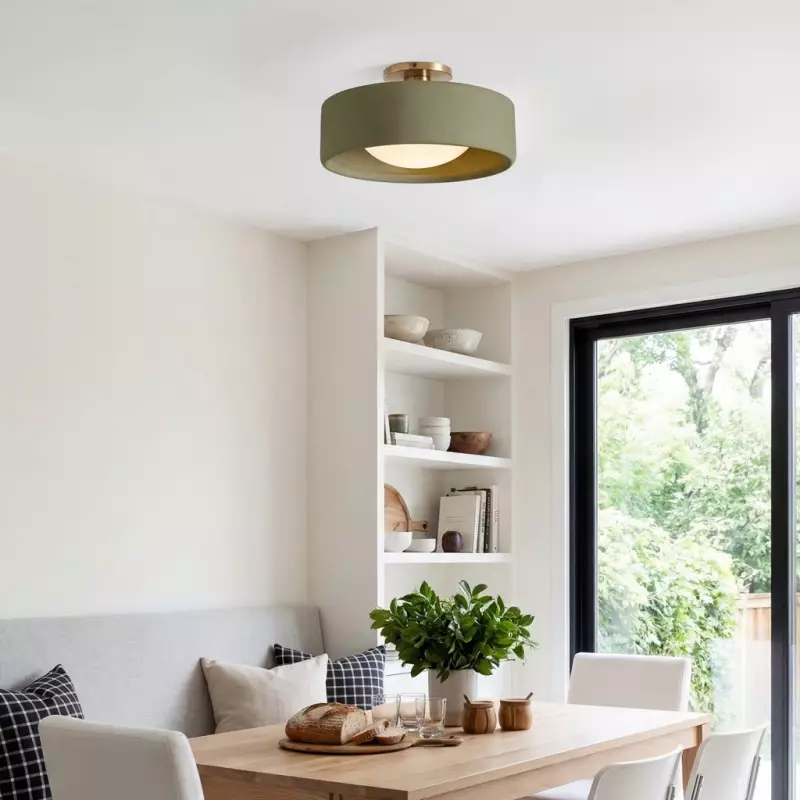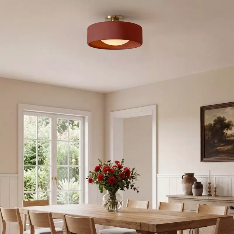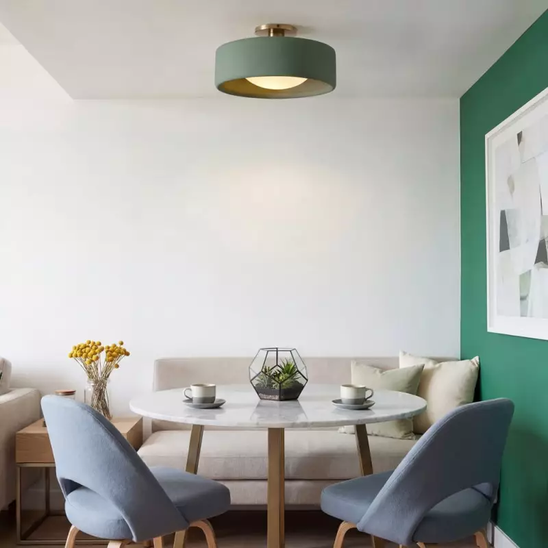 This minimalist porcelain flush mount ceiling light, characterized by its elegant white drum shade and a sophisticated brass-finished base, presents a contemporary ceiling light solution. Available in a variety of colors, it offers flexibility to match diverse interior designs. Whether as bedroom ceiling light fixtures or for illuminating hallways and living rooms, this semi flush mount lighting option seamlessly combines functionality with style.