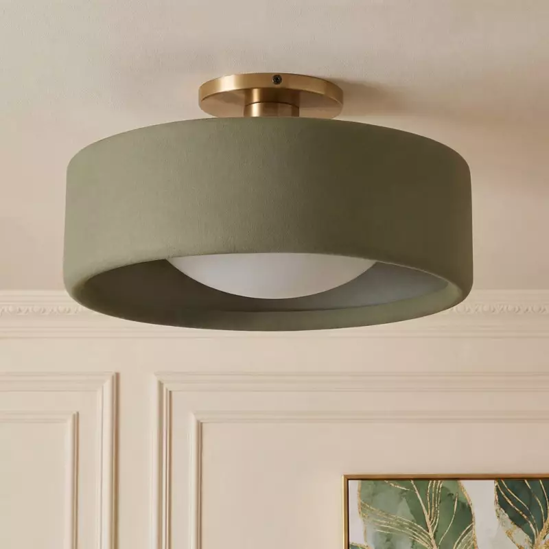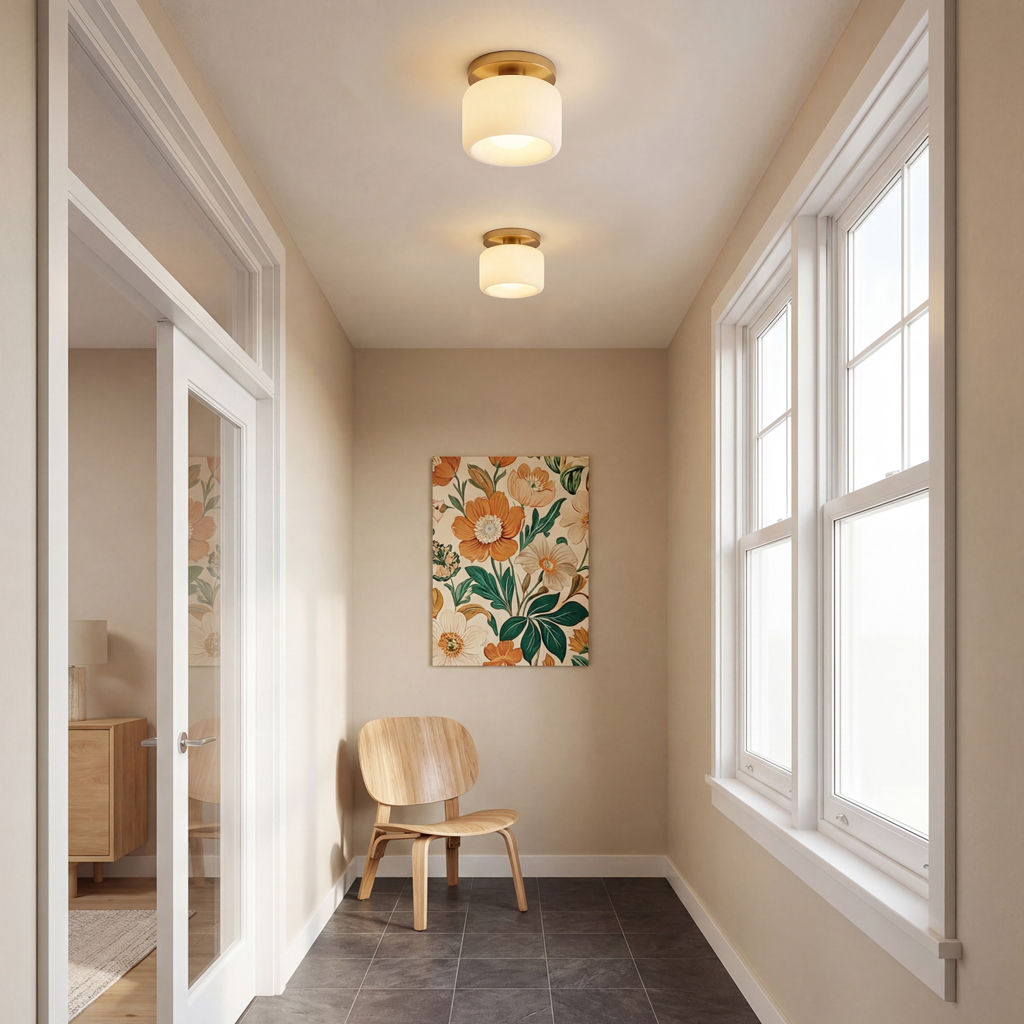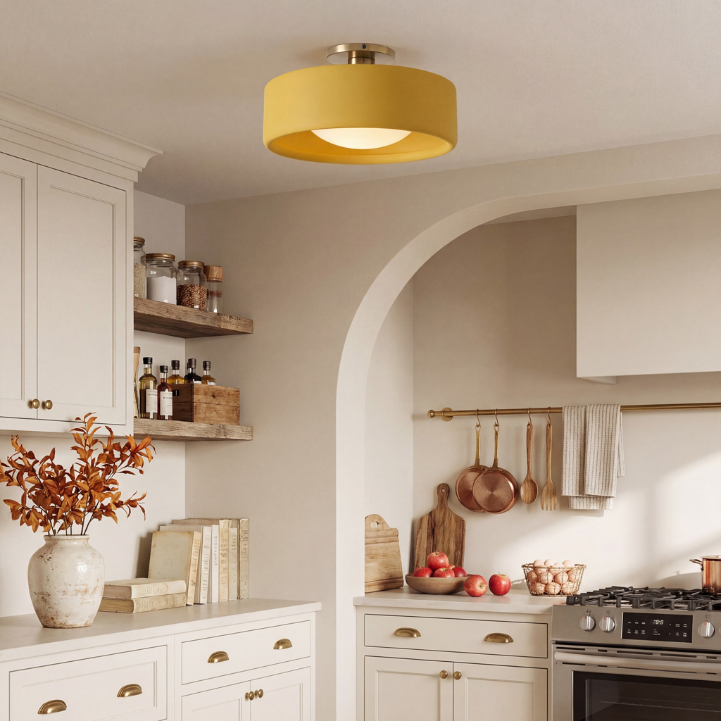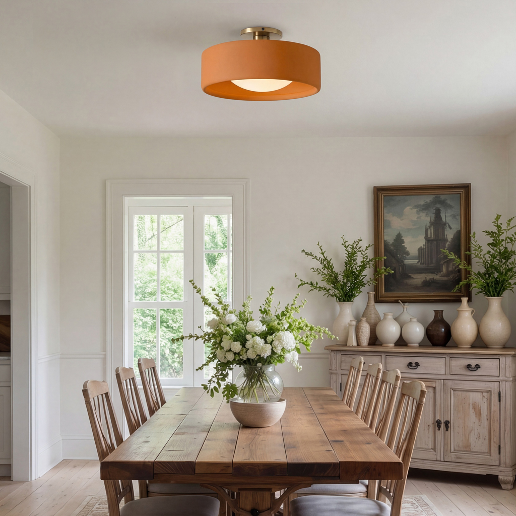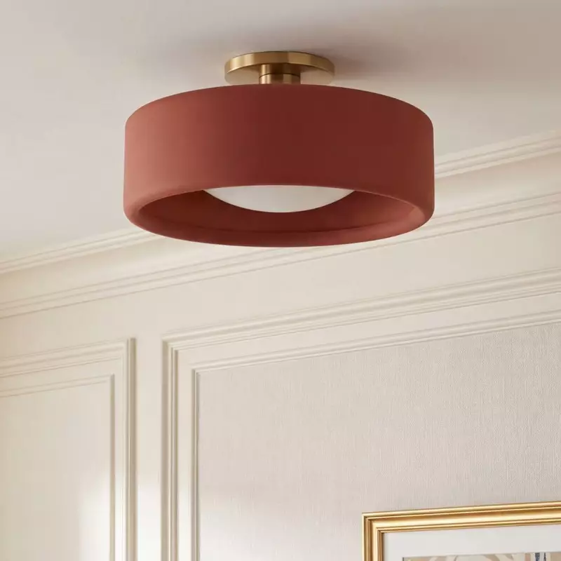 This minimalist porcelain flush mount ceiling light, characterized by its elegant white drum shade and a sophisticated brass-finished base, presents a contemporary ceiling light solution. Available in a variety of colors, it offers flexibility to match diverse interior designs. Whether as bedroom ceiling light fixtures or for illuminating hallways and living rooms, this semi flush mount lighting option seamlessly combines functionality with style.