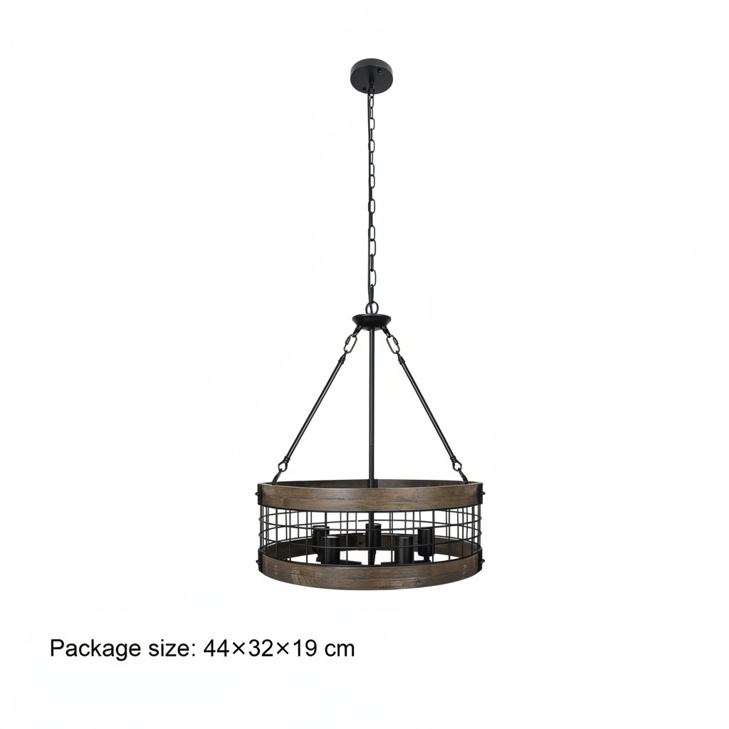• Featuring a round drum-shaped wooden frame and black iron cage, it provides ample lighting while adding rustic charm to any space.
