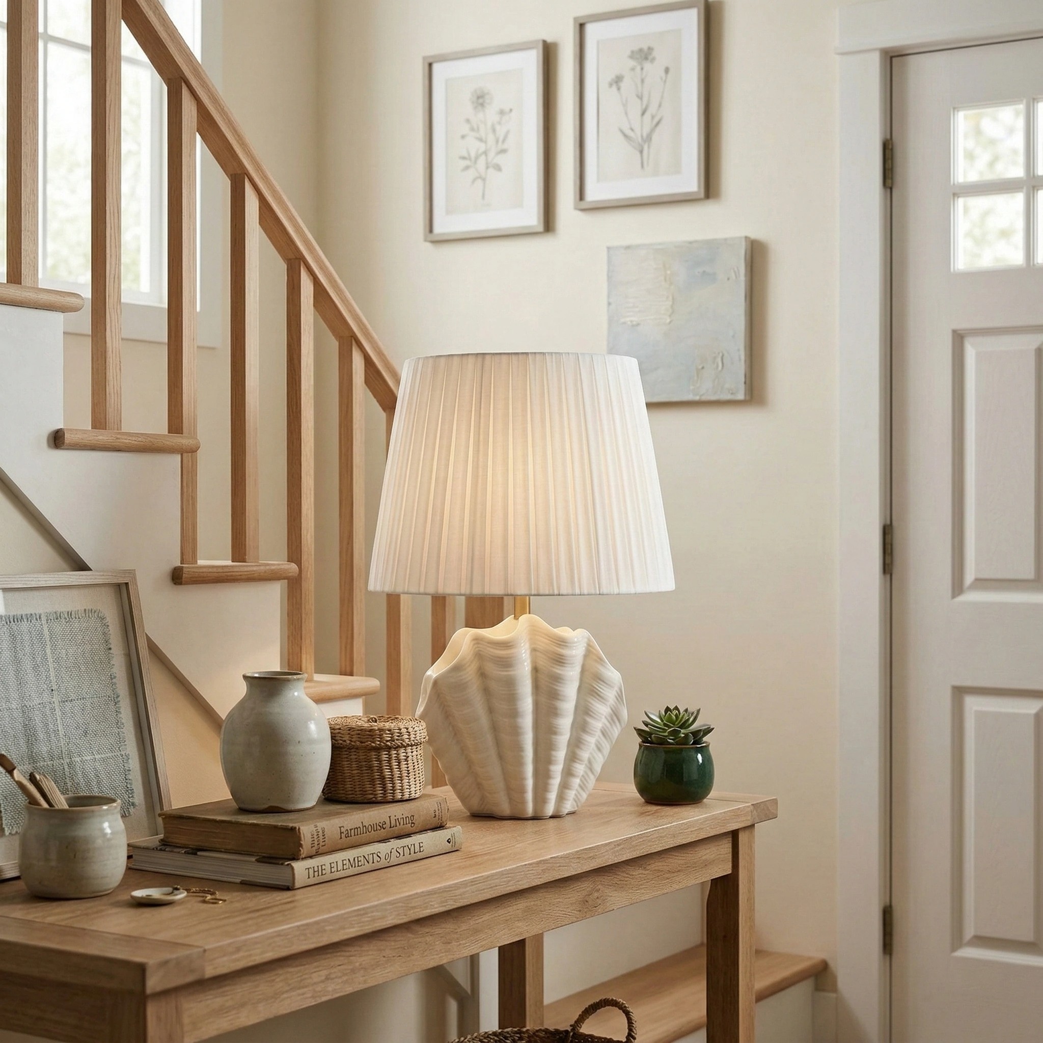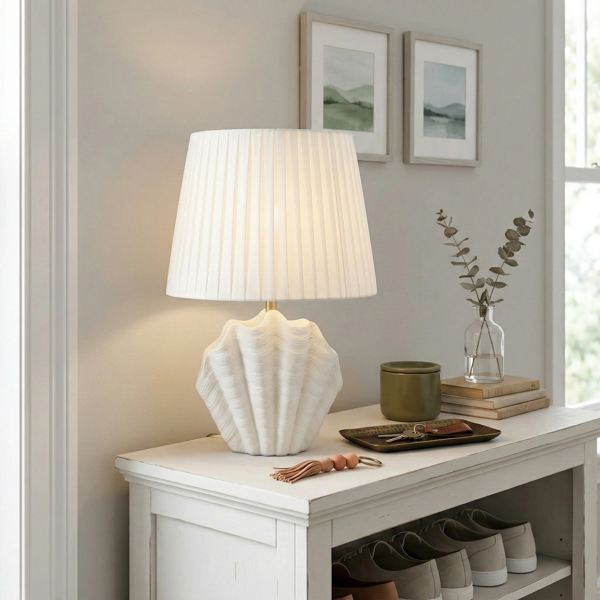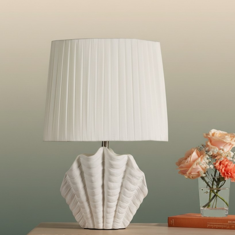 This shell-inspired table lamp, featuring a textured matte white ceramic base and an ivory faux silk drum shade, casts a gentle, warm glow that enhances bedrooms, bedside tables, consoles, or cozy reading corners with serene coastal elegance.