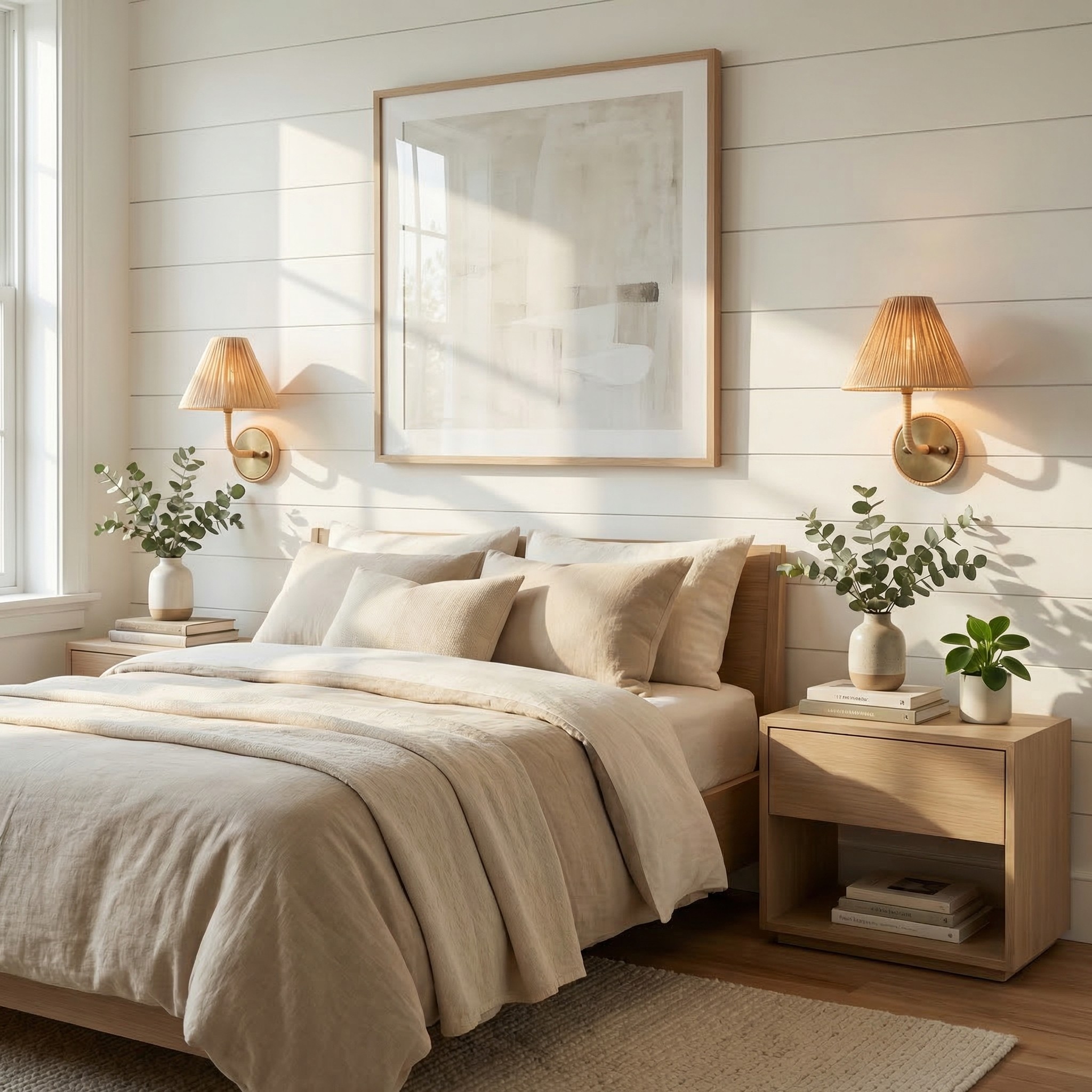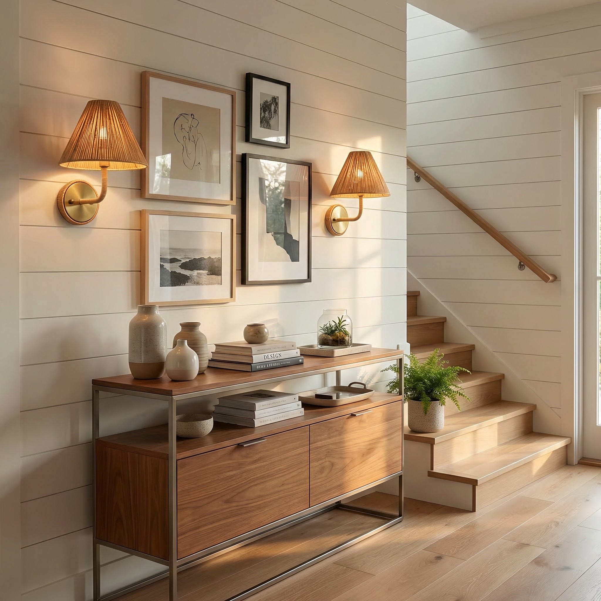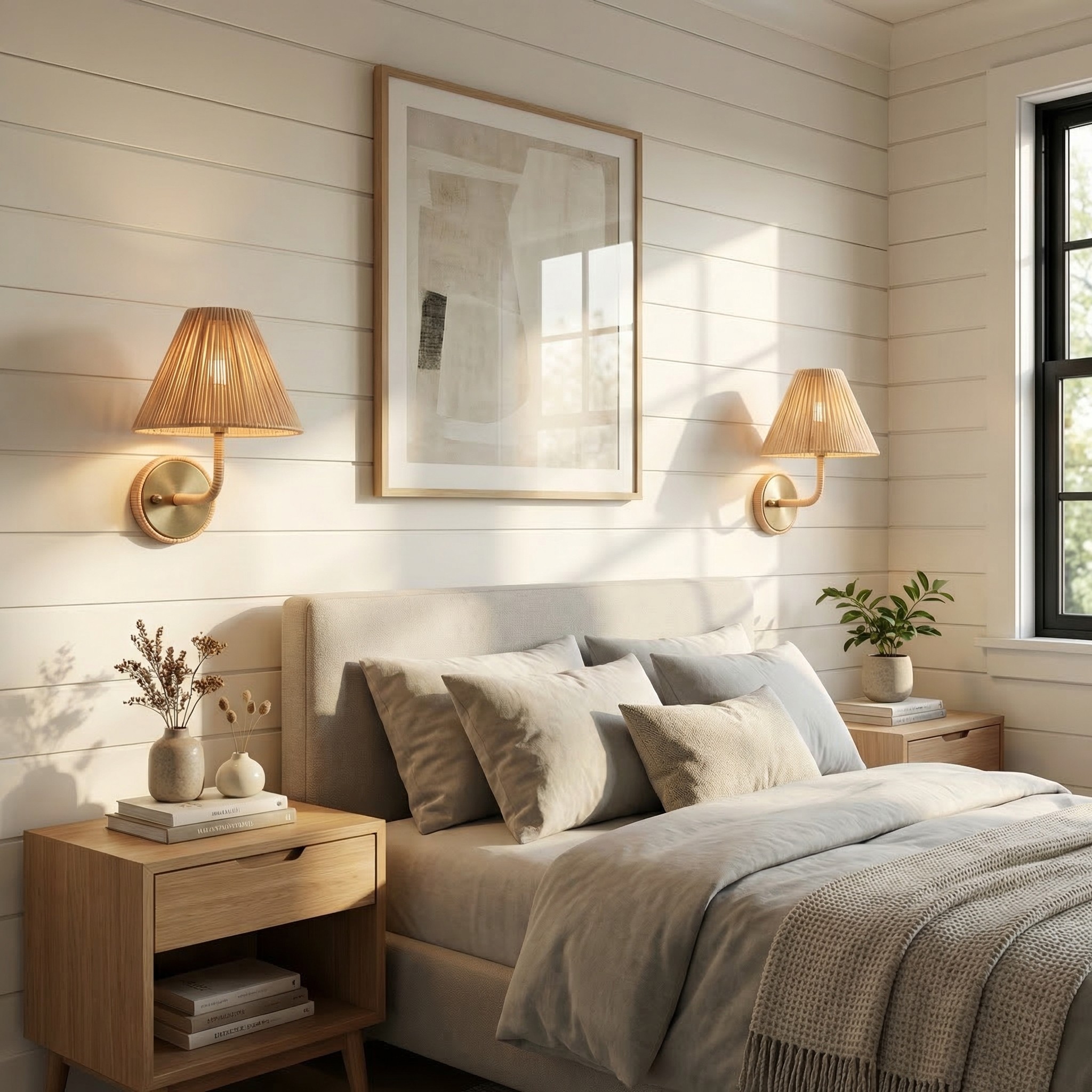 This Natural Woven Rattan Cone Wall Sconce, a rattan wall lamp crafted from natural woven rattan and metal with antique brass accents, brings a rustic, coastal, and boho style to your bedroom, living room, entryway, corridor, or stairwell.