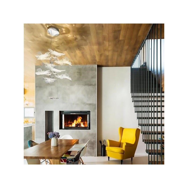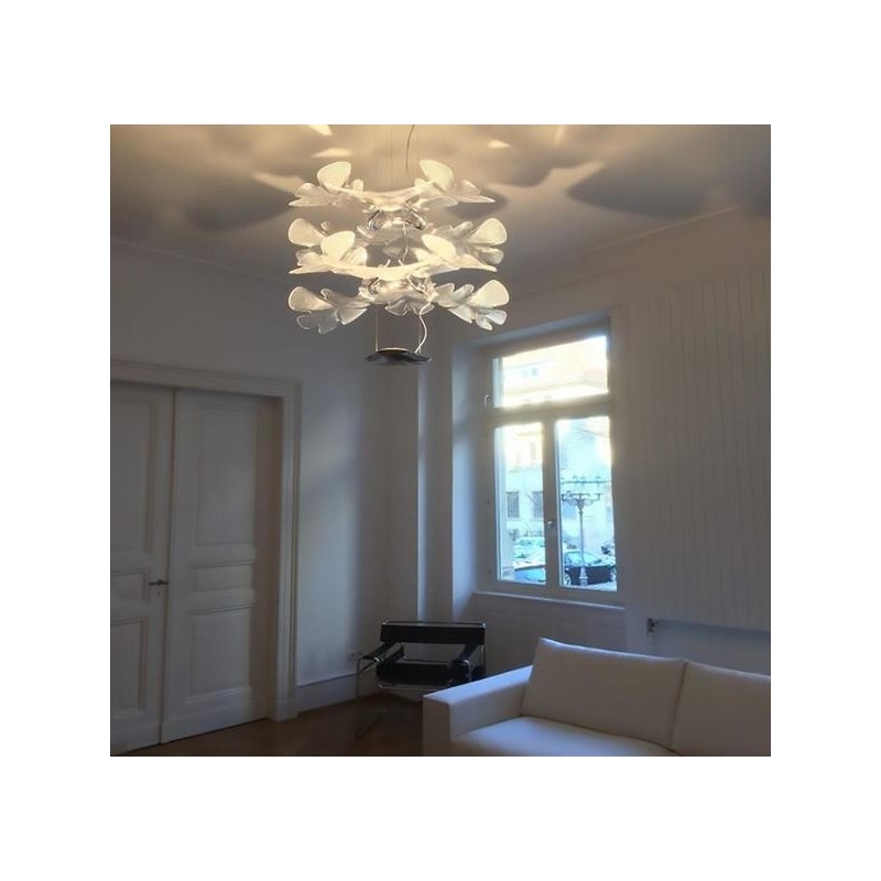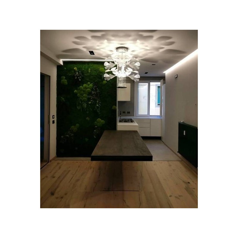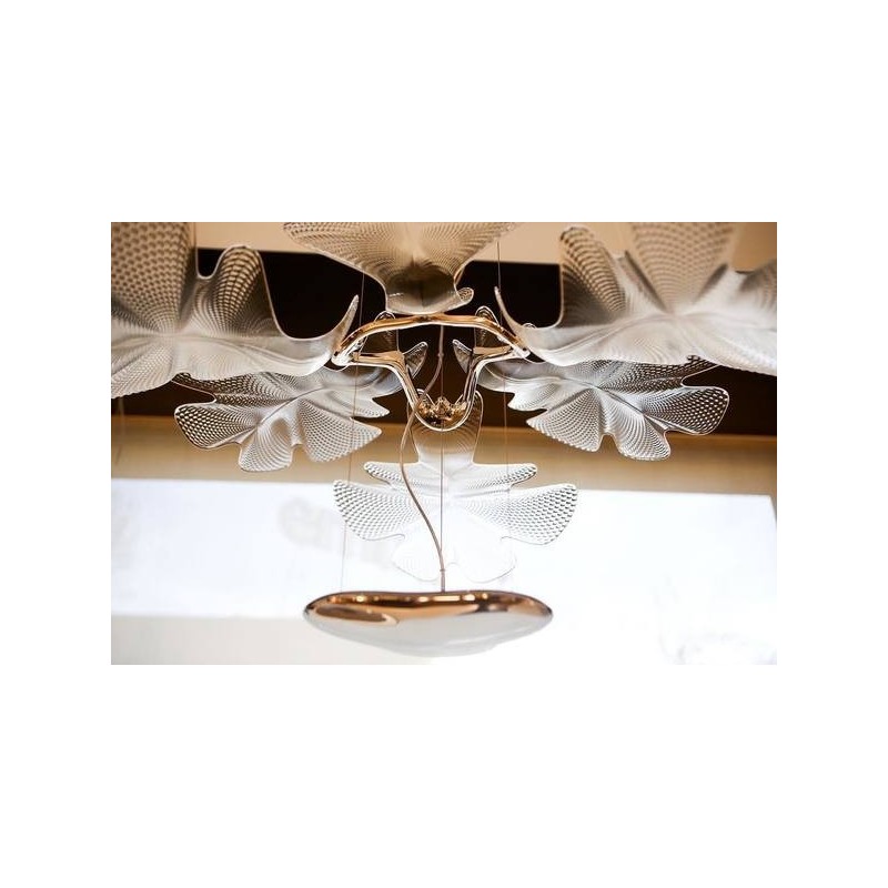 Phytomorphic elements of molded PMMA feature gently wavy texture and an uneven stepped section that works as an optical lens. The central suspended COB body acts as a heatsink and emits indirect light filtered and refracted by 3 clear leaf-shaped surfaces. Can be installed singly or in multiple composition for scenic, reflected effect on the ceiling.- Please note: Your payment does not include customs duties, local taxes or any other import costs.