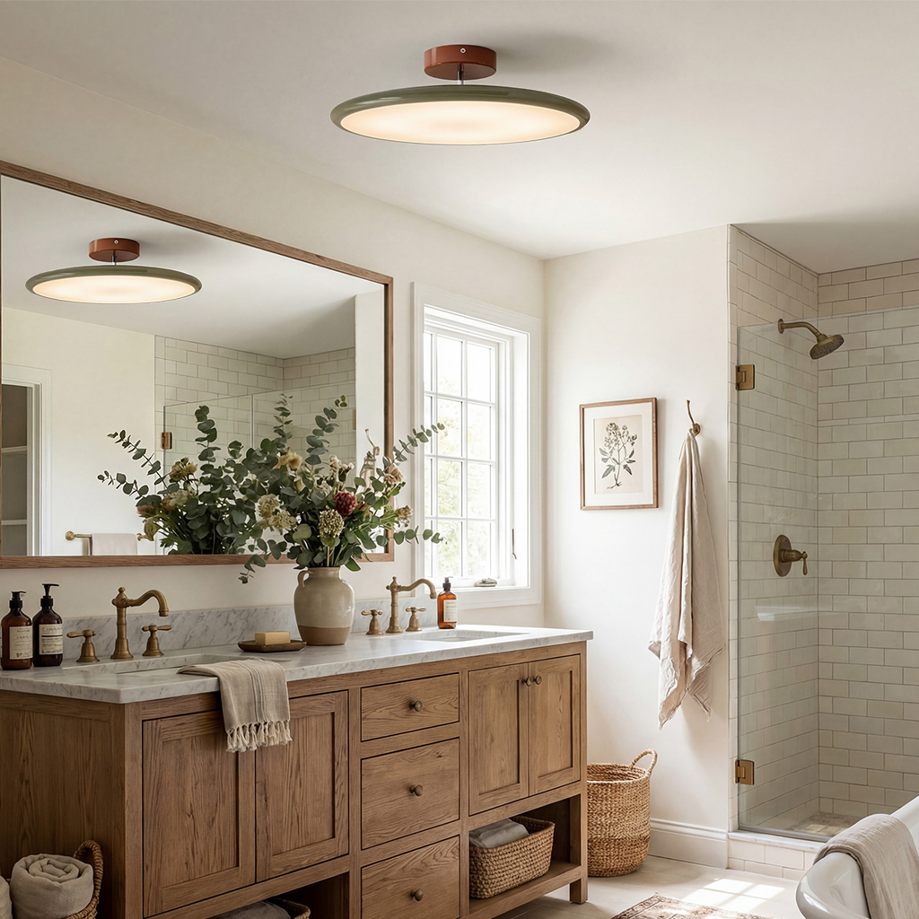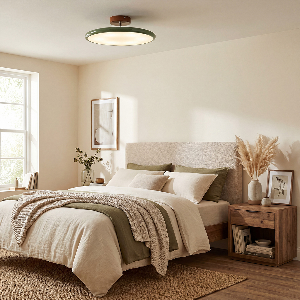 The macarons round ceiling lamp boasts a modern, minimalist design with a sturdy, rustic metal frame and a translucent white acrylic shade that offers bright, even lighting to protect eyes from glare.
