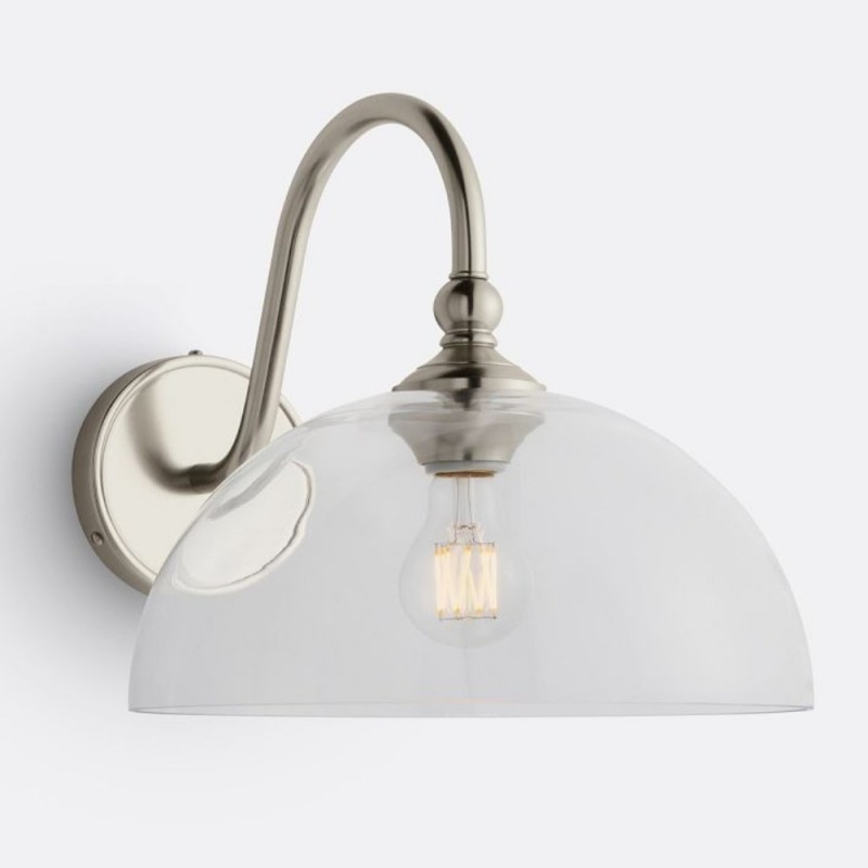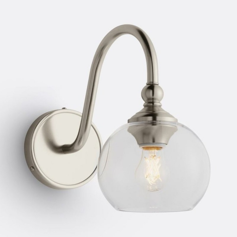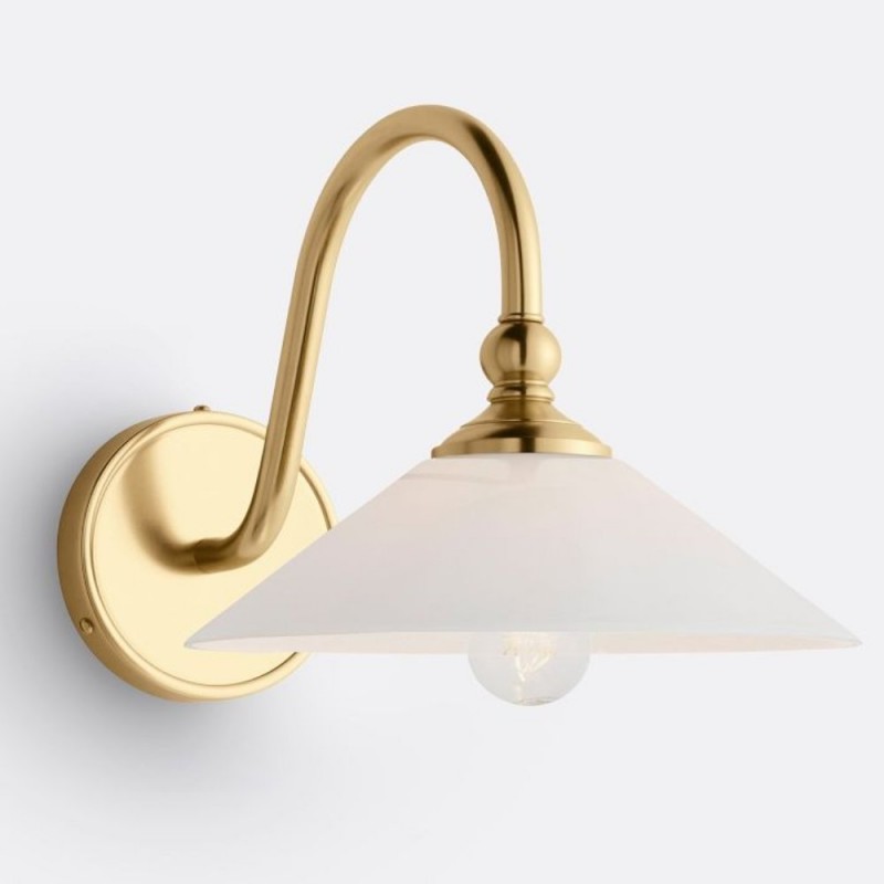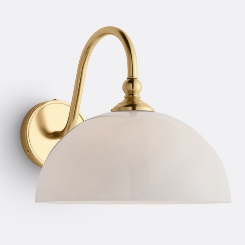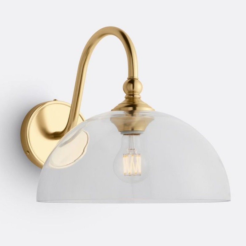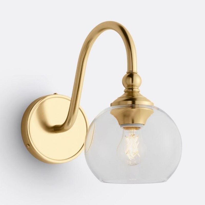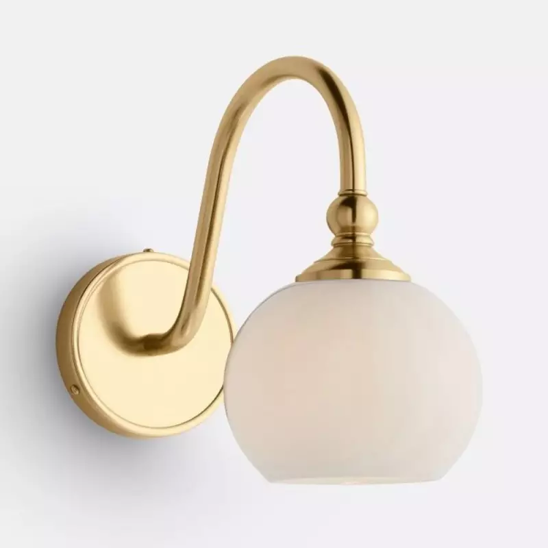 This wall sconce showcases a gracefully curved brass arm paired with a smooth glass shade, capturing vintage character with refined elegance. Its softly diffused glow creates a warm, welcoming ambiance—perfect for hallways, bedrooms, and bathrooms.