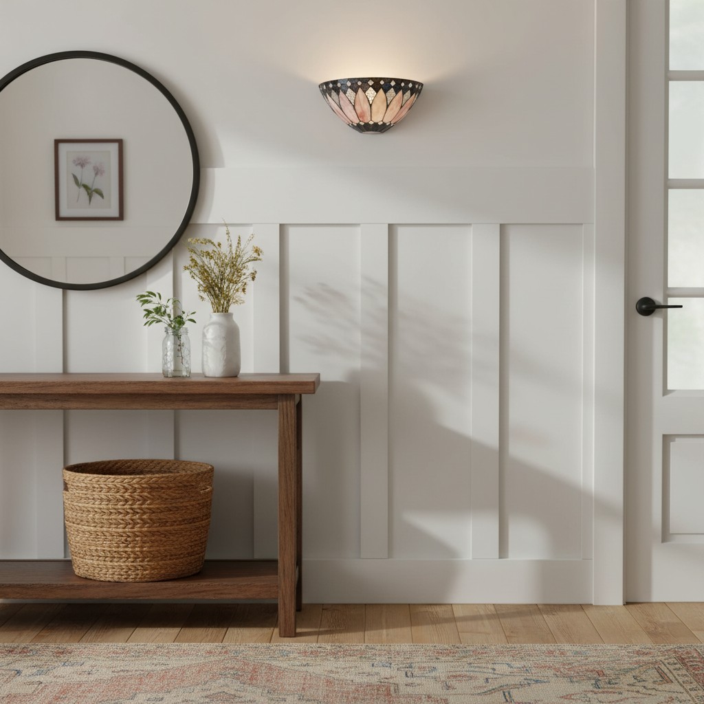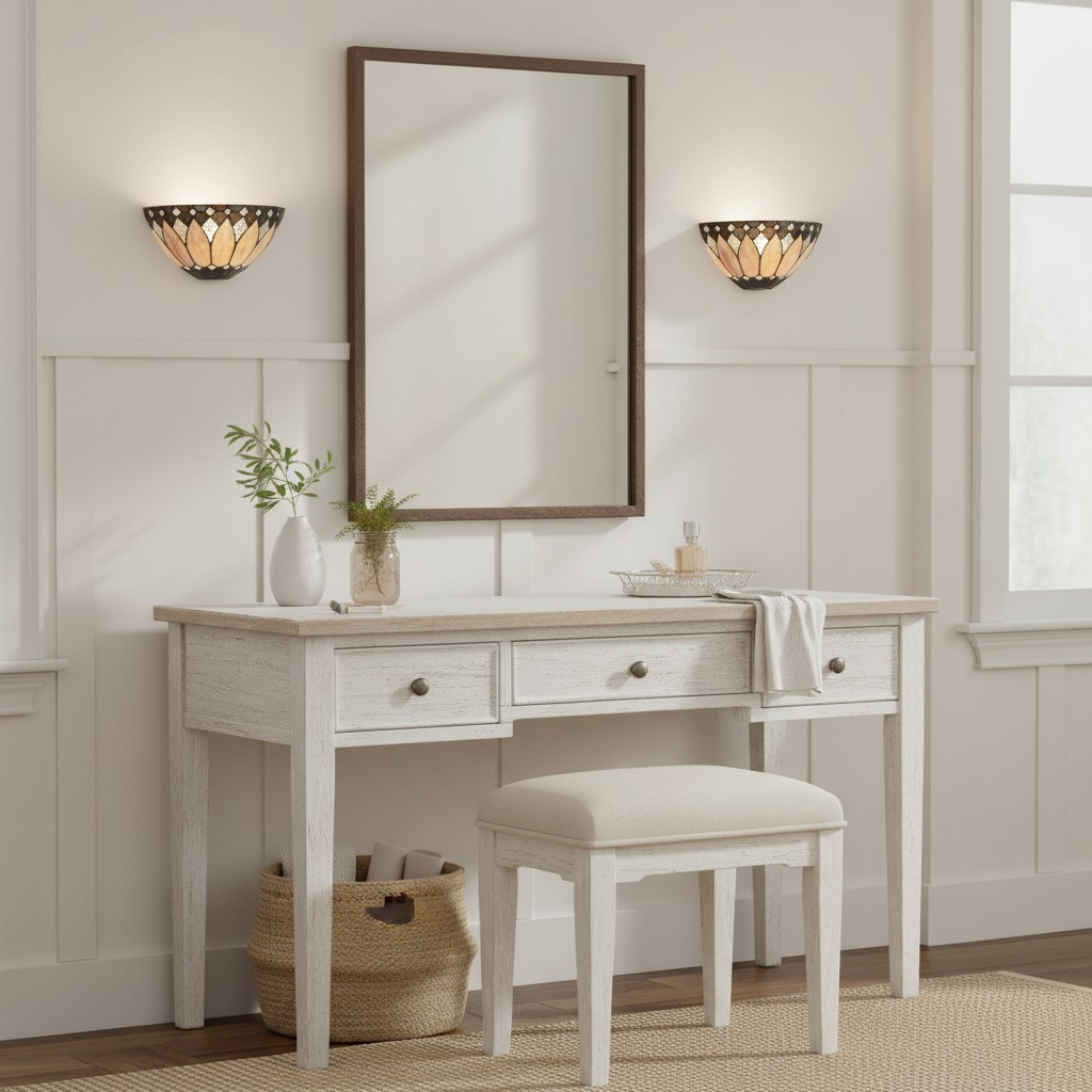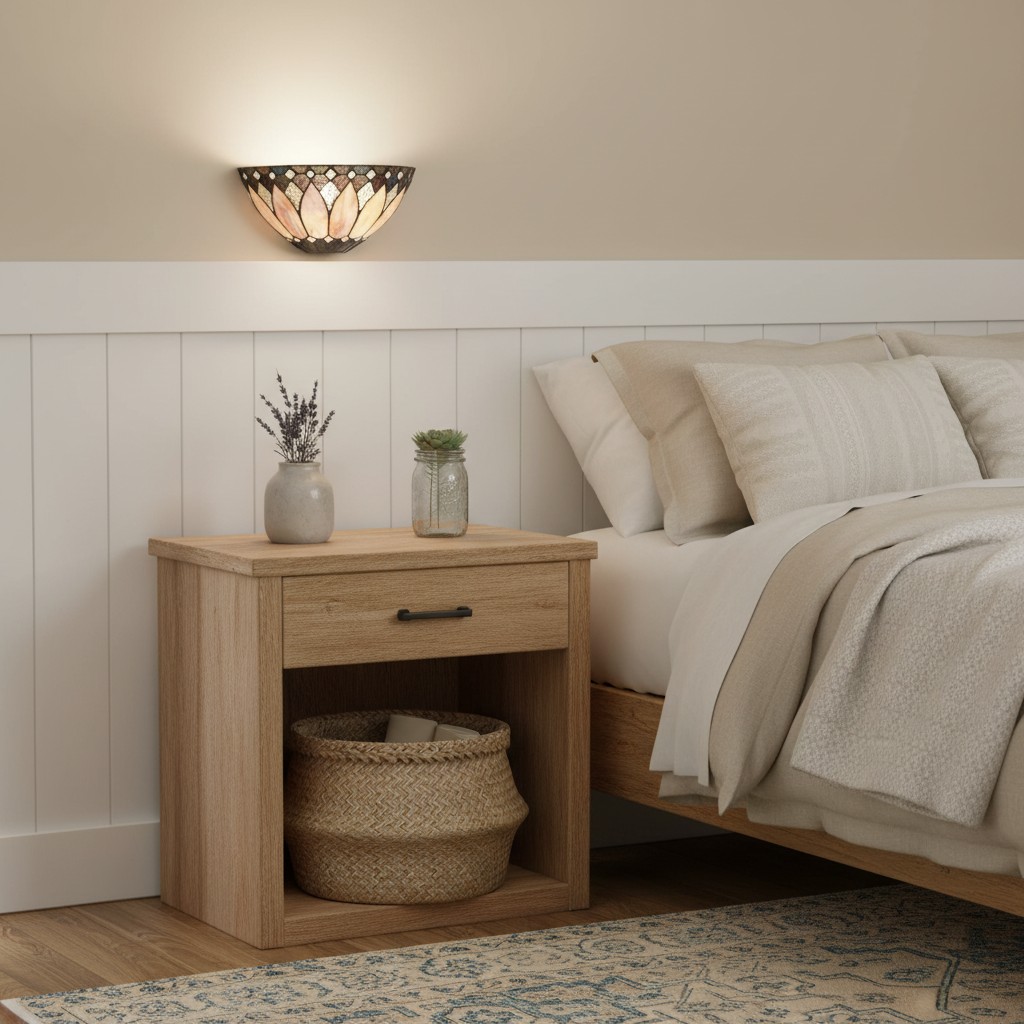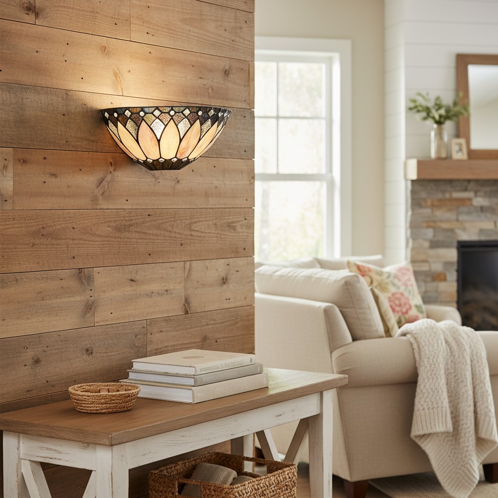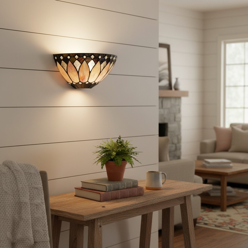 This handcrafted stained glass light features artisan-cut glass panels in soft beige and pink tones, arranged in a floral-petal half-dome design. The upward-facing shade gently diffuses warm, ambient light, adding a vintage decorative accent perfect for bedrooms, dining areas, or cozy reading corners.