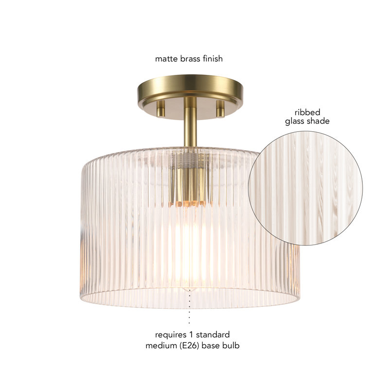 Featuring a clear ribbed glass shade, this fixture adds a refined texture that beautifully diffuses light, casting a warm and inviting glow. The sleek matte brass finish provides a timeless appeal, seamlessly blending vintage charm with contemporary sophistication.