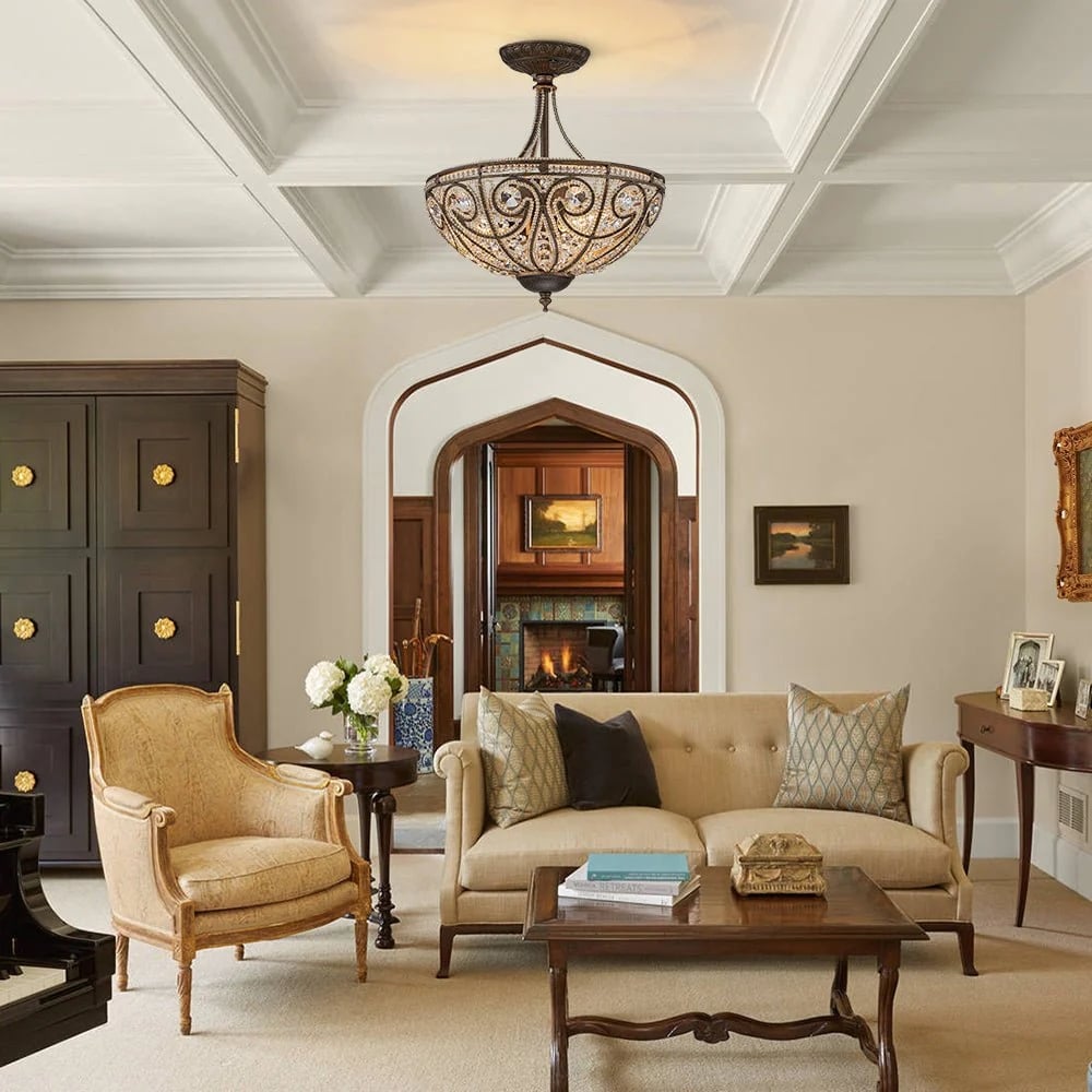 The antique bronze finish and ornate crystal beads, perfect for traditional, farmhouse, or eclectic interiors. Its semi-flush mount design makes it ideal for low to medium-height ceilings in hallways, entryways, dining rooms, bedrooms.