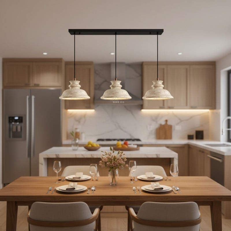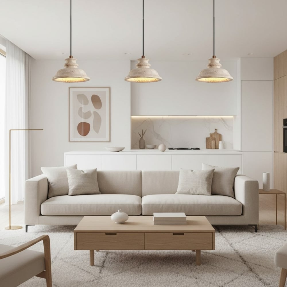 This pendant light features a sculpted travertine stone shade creating a wabi-sabi inspired aesthetic. The warm, ambient glow emitted through the travertine shade enhances the inviting atmosphere of your space, making it perfect for kitchens, dining areas, living rooms, or bedrooms.