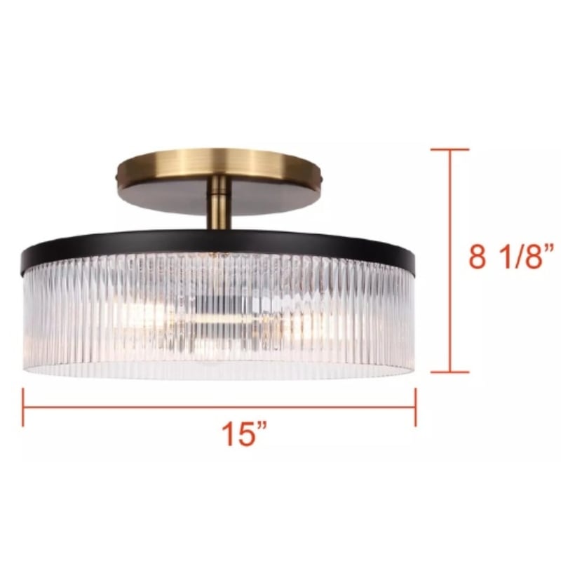 The ceiling light features a ribbed glass drum shade and gold and black finish with 3 lights. Whether illuminating a cozy dining nook, casting a warm glow over a kitchen island, or adding a touch of elegance to a bedroom, this ceiling light elevates the ambiance of every setting.