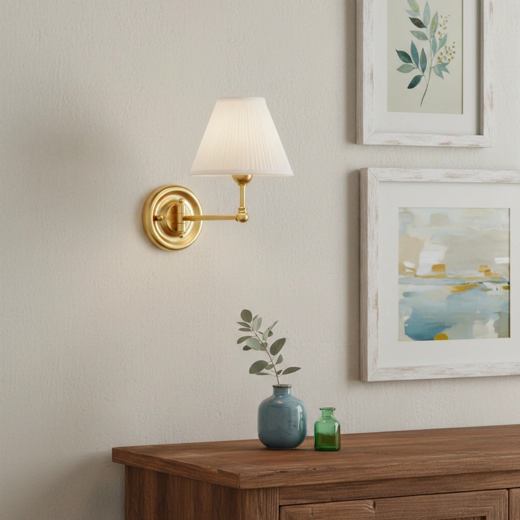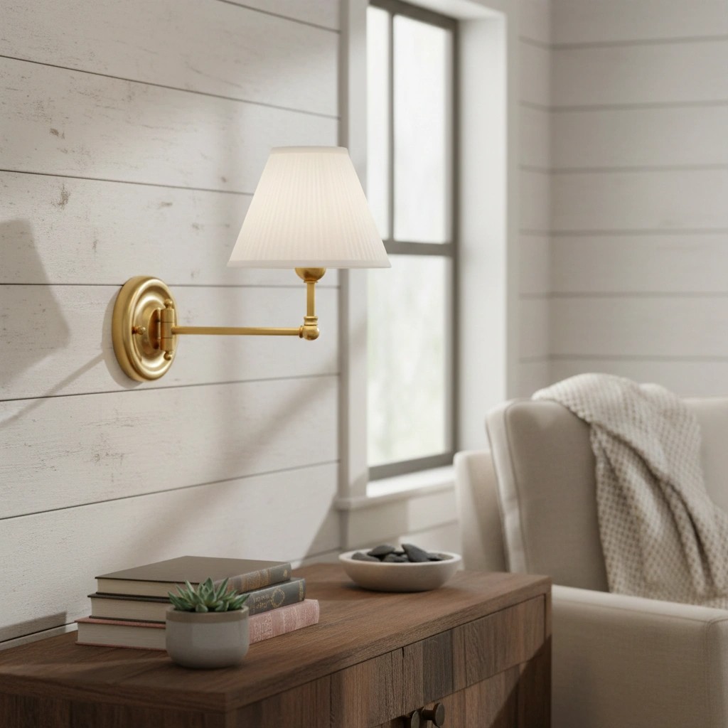 • Classic Farmhouse Charm – Conical design with brass sconce and fabric shade brings rustic elegance to any room.