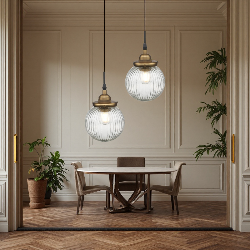 Brighten your space using our Rustic Ribbed Glass Globe Pendant Light. Offered in antique brass or black, featuring a charming ribbed glass globe, it suits kitchen islands, bedrooms, living rooms, and dining rooms perfectly. Blending vintage and modern vibes, it casts beautiful light patterns to enhance your decor.