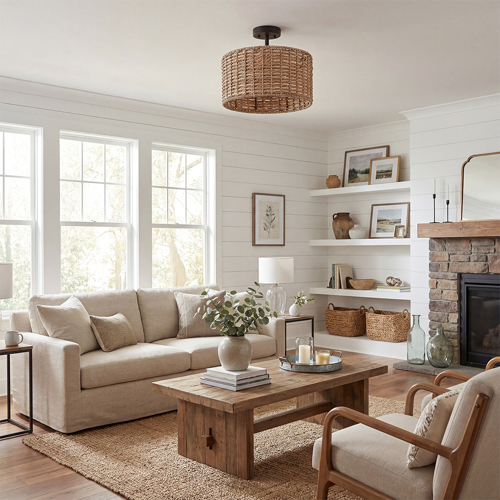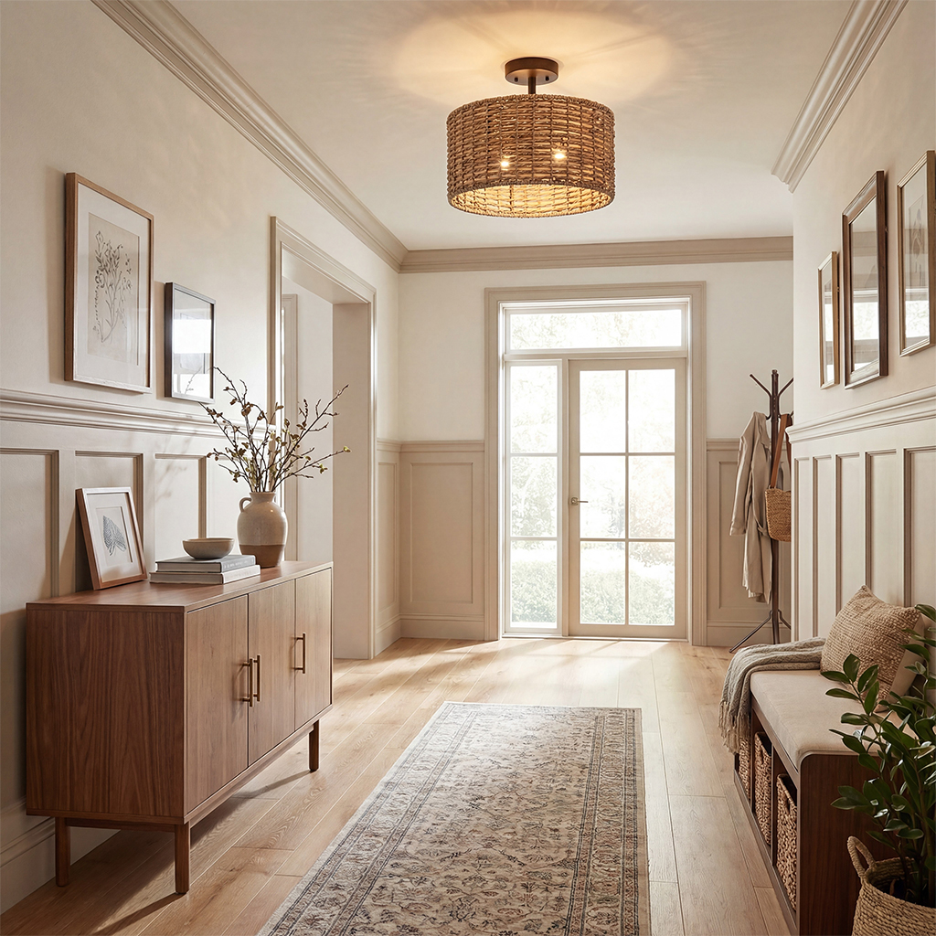 Lannister Coastal 2-Light Semi-Flush Mount Ceiling Light with Hand Woven Drum Shade for Bedroom