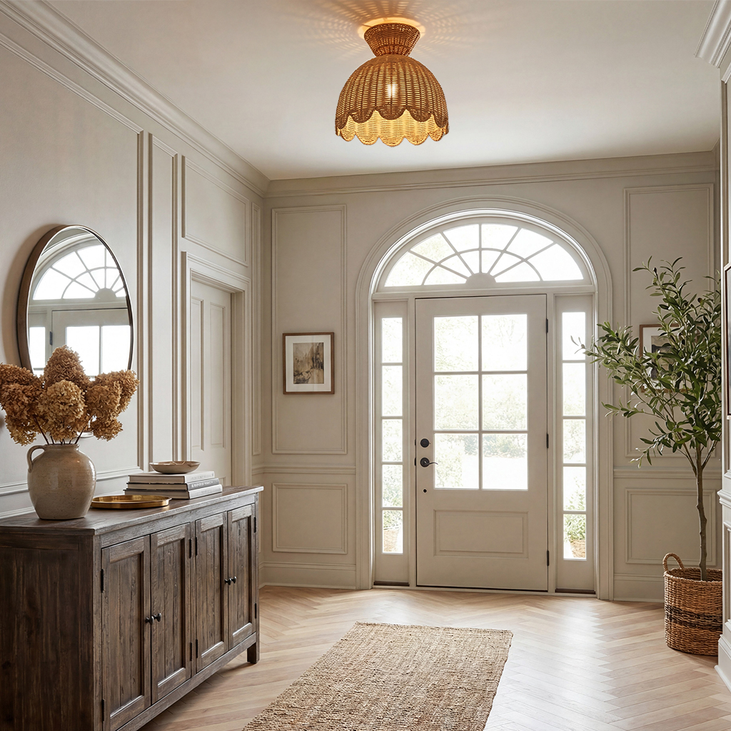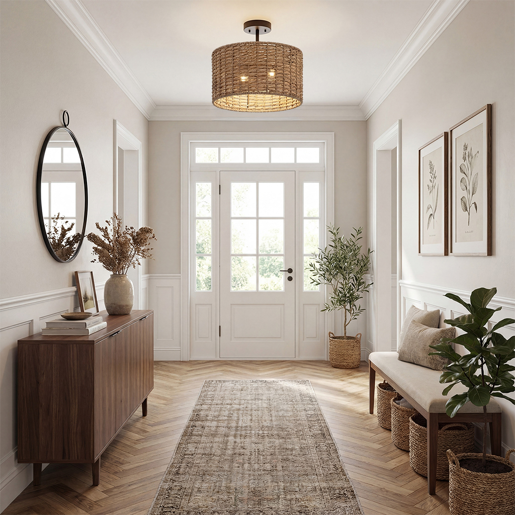 Crafted with meticulous attention to detail, this flush mount features natural rattan and seagrass handwoven into a sleek drum shape. Housed within, a cluster of two matte black lights radiates ample illumination, casting intriguing shadow patterns onto the walls of your foyer, dining area, or bedroom.