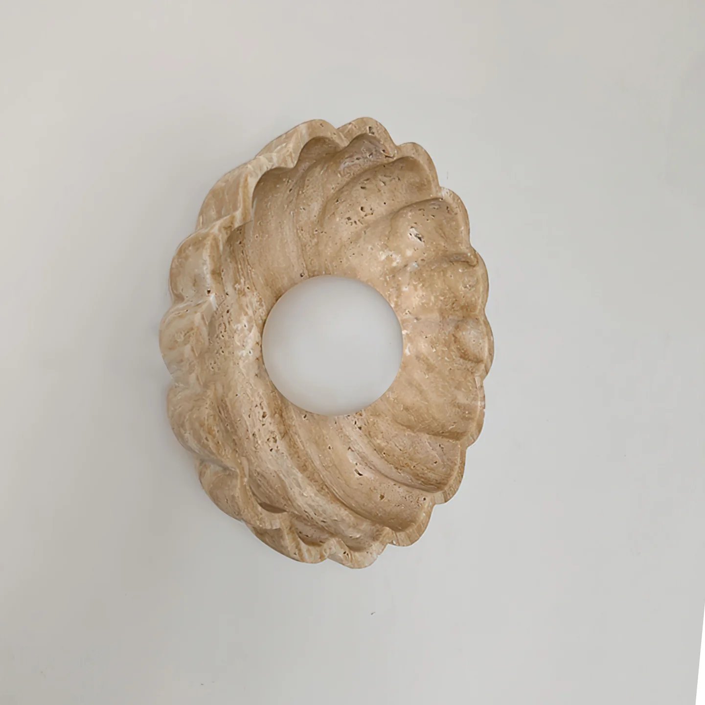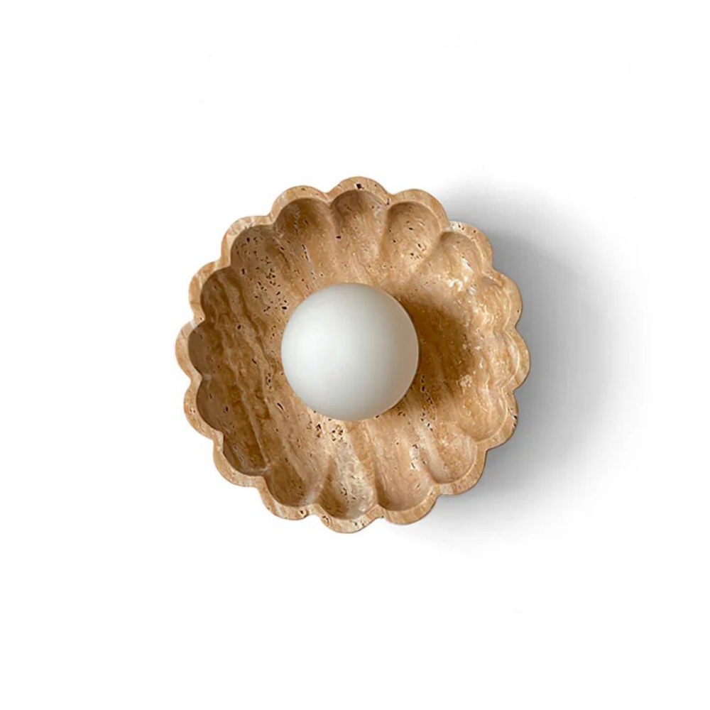 This elegant travertine scalloped wall sconce features a natural stone frame and a frosted glass globe, casting a soft warm glow. It brings organic, wabi-sabi charm to bedrooms, hallways, and living spaces with its delicate floral silhouette.