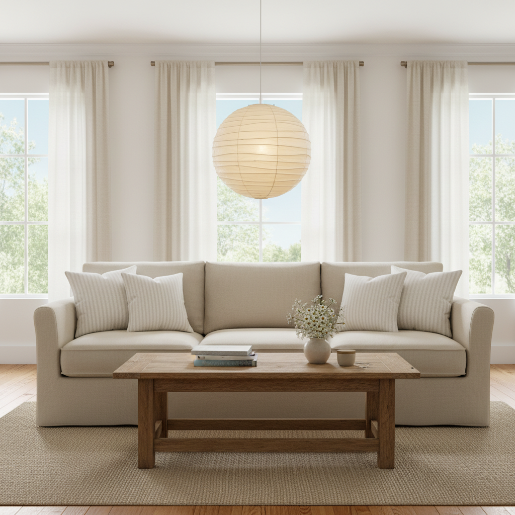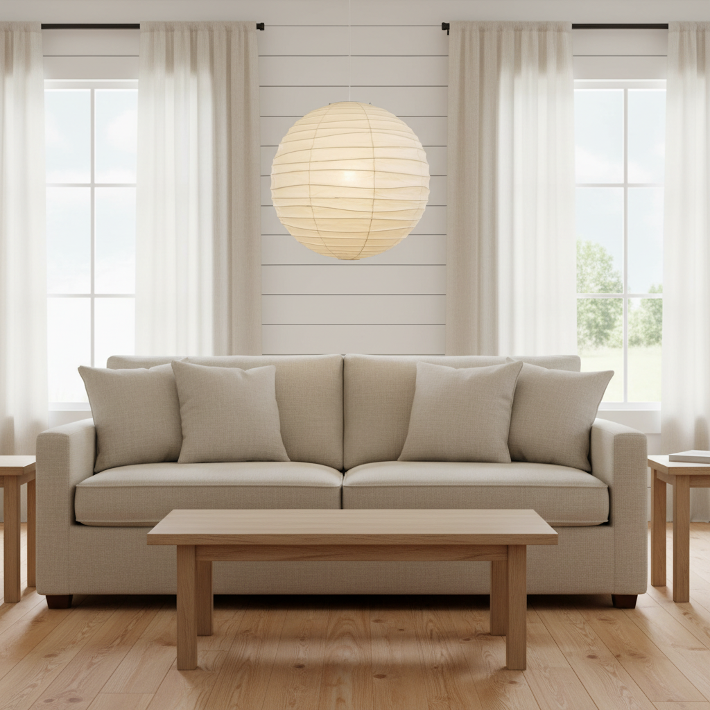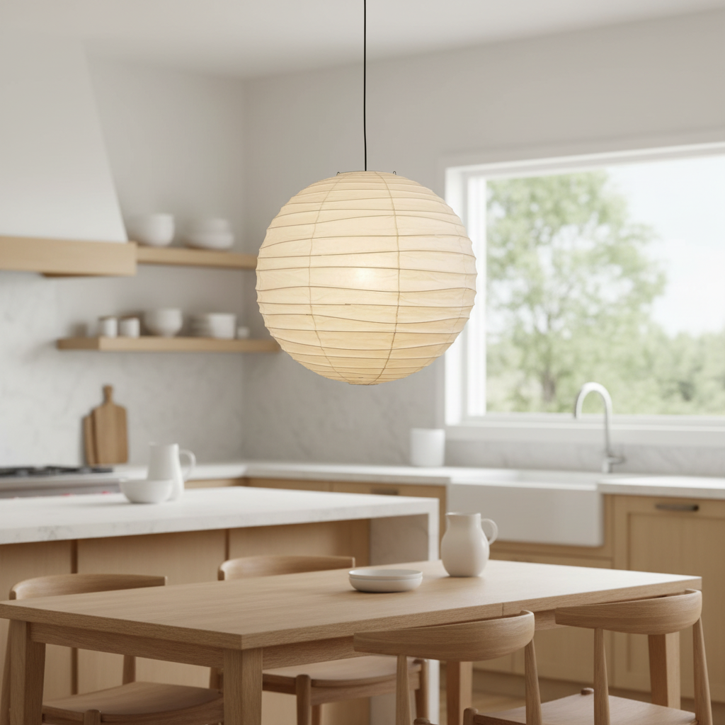 Crafted from traditional washi paper and bamboo silk, this iconic round pendant lamp emits a soft, gently diffused glow that brings calm and warmth to any space. Inspired by mid-century Japanese design, its sculptural form creates an inviting atmosphere above dining tables, kitchen islands, living rooms, or serene reading corners, blending effortlessly into minimalist and modern interiors.