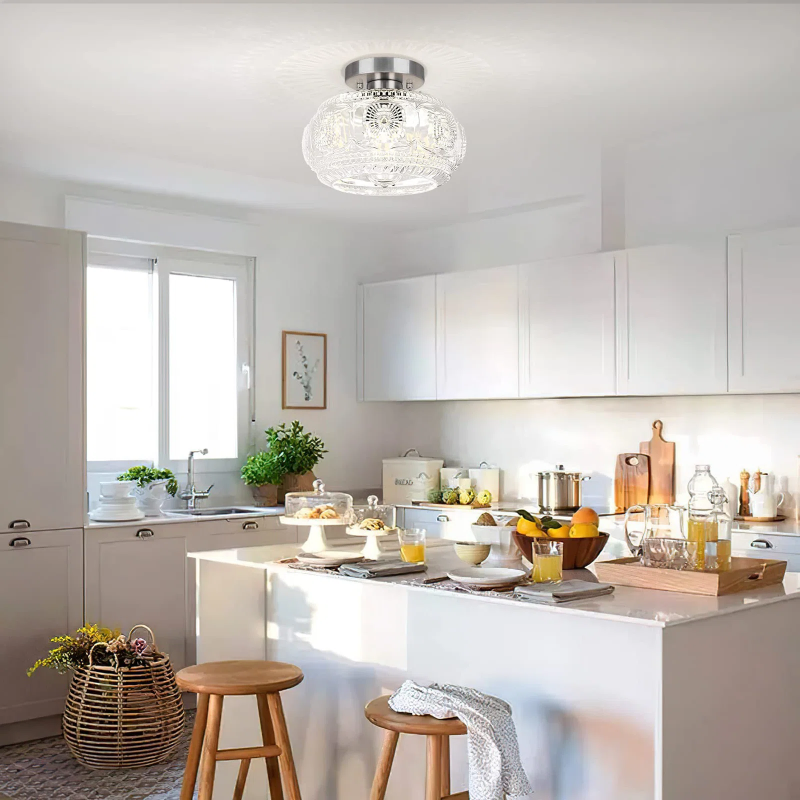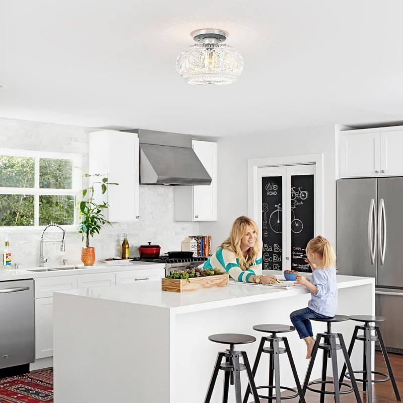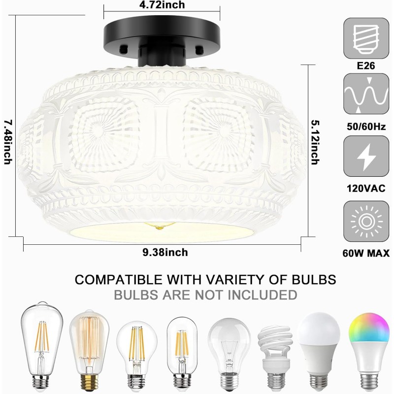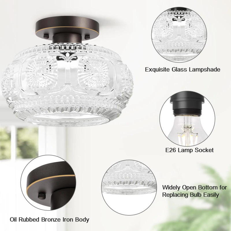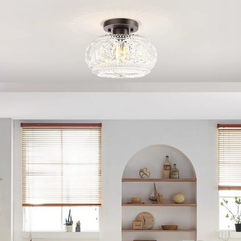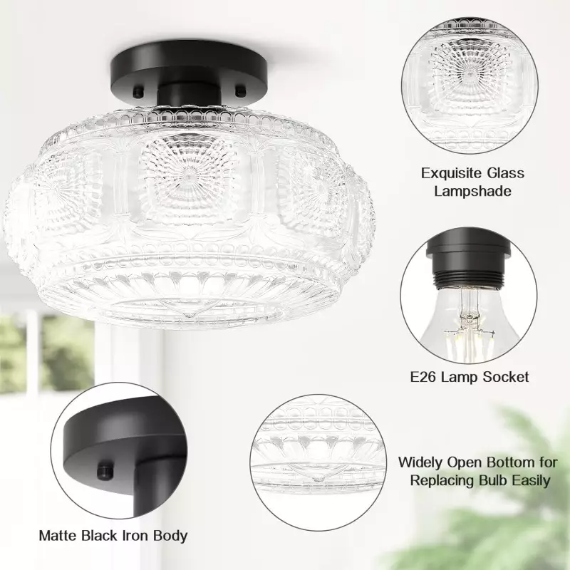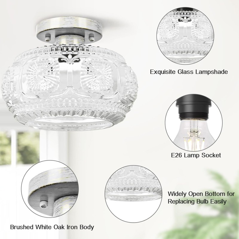 Farmhouse-styled ceiling light with engraved glass pattern, upgraded and larger semi-flush mount fixture crafted from clear glass, vintage aesthetic ideal for hallways, kitchens, bedrooms, and dining rooms.