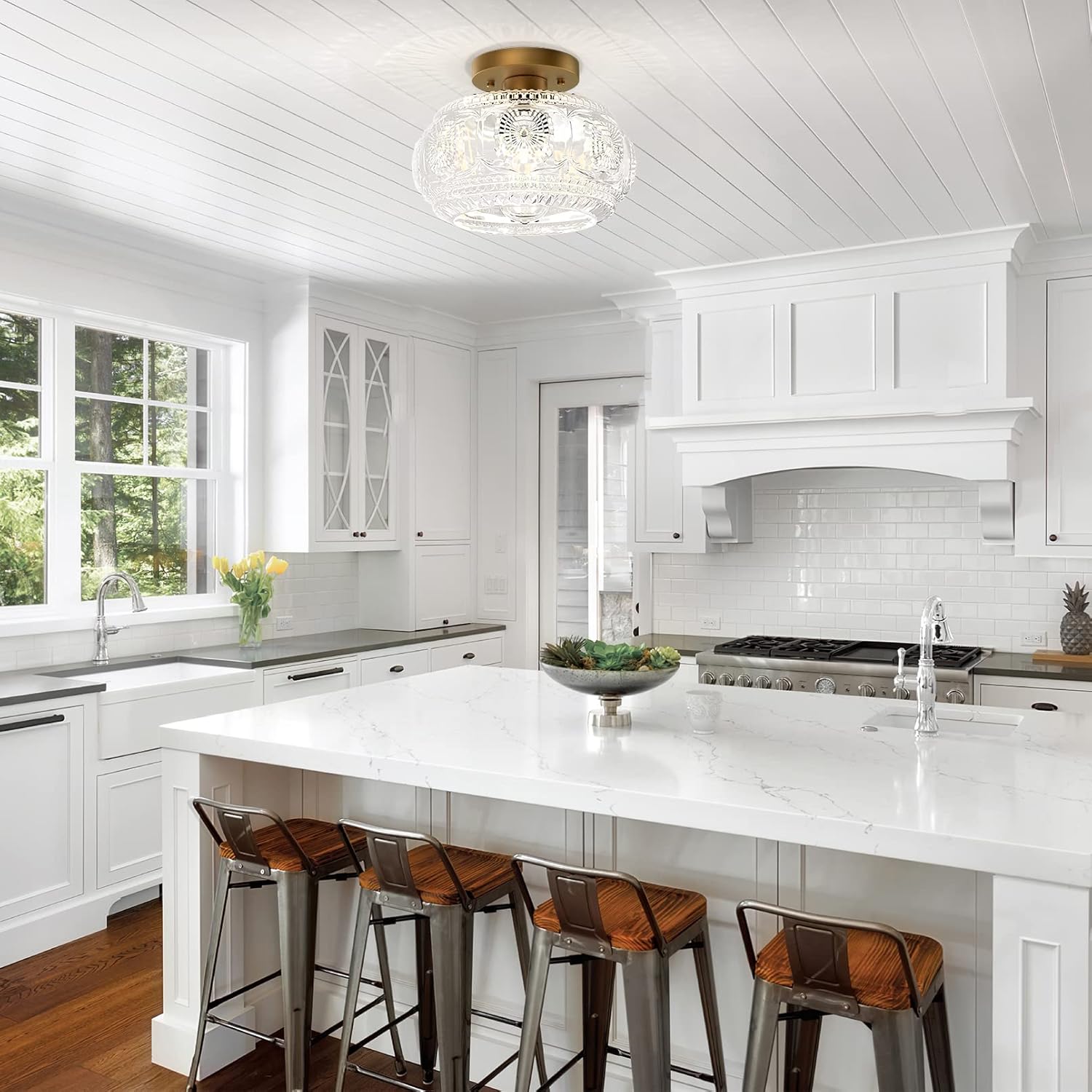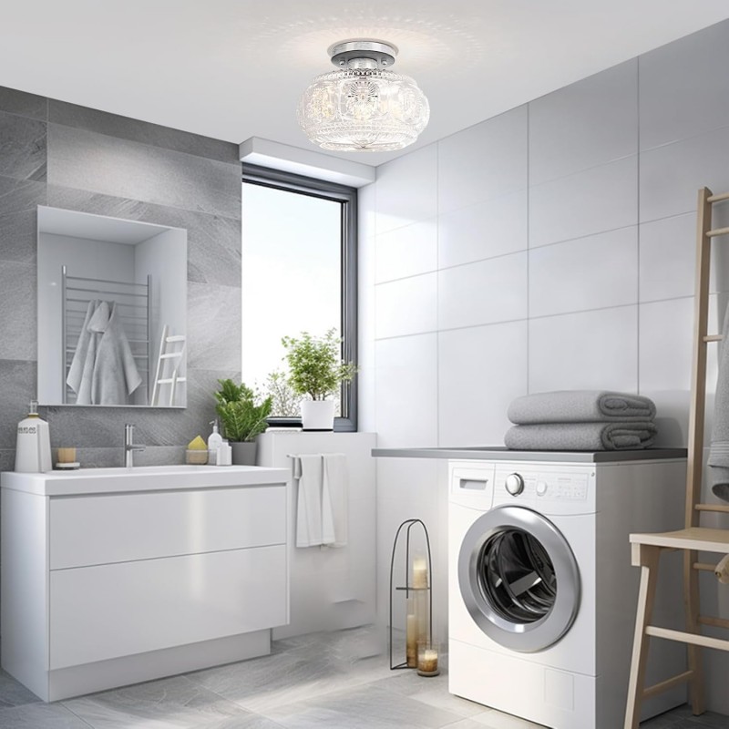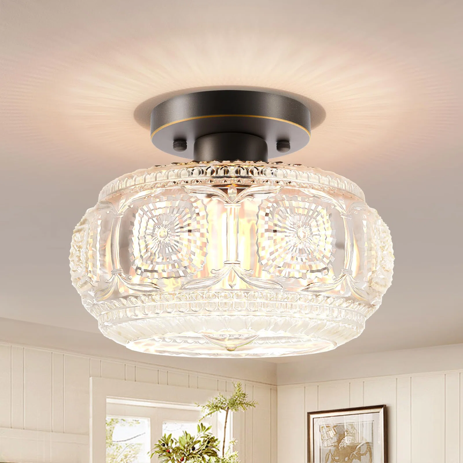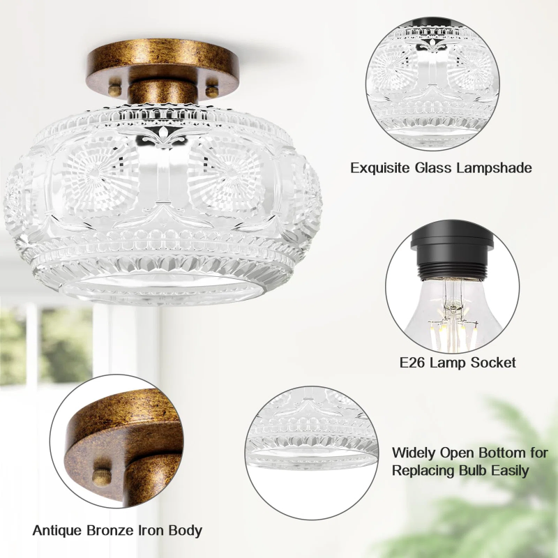 Farmhouse-styled ceiling light with engraved glass pattern, upgraded and larger semi-flush mount fixture crafted from clear glass, vintage aesthetic ideal for hallways, kitchens, bedrooms, and dining rooms.