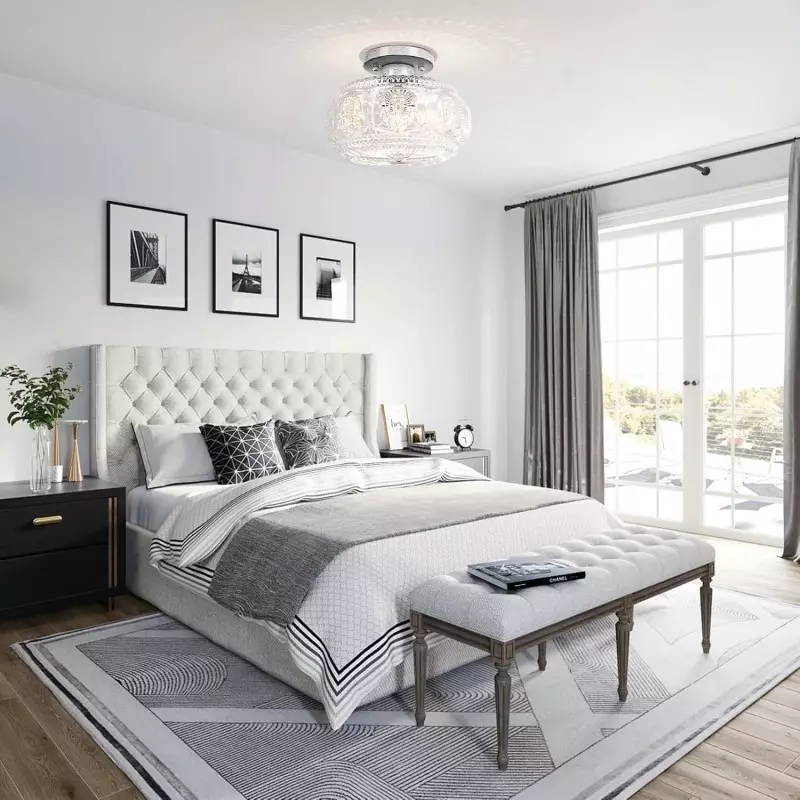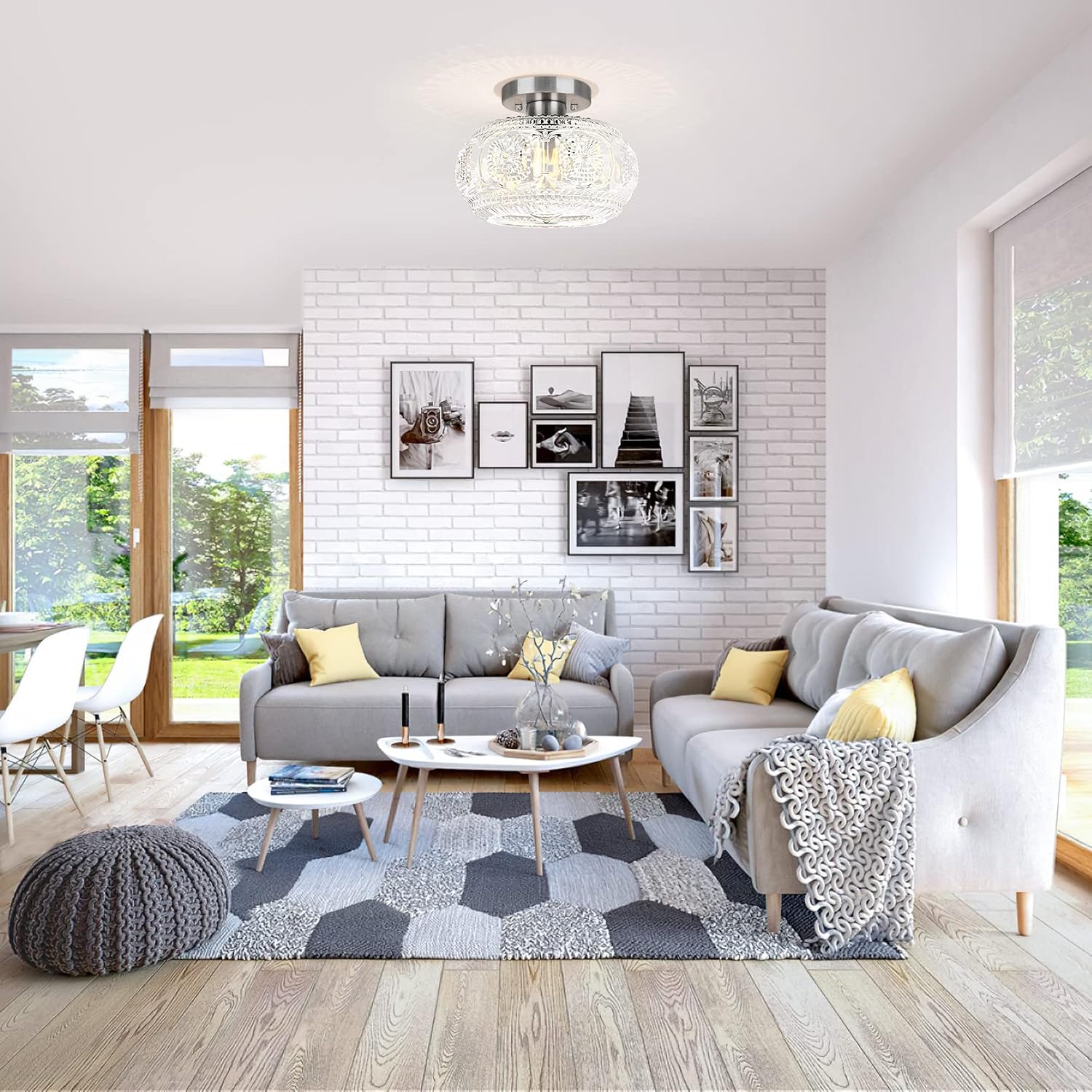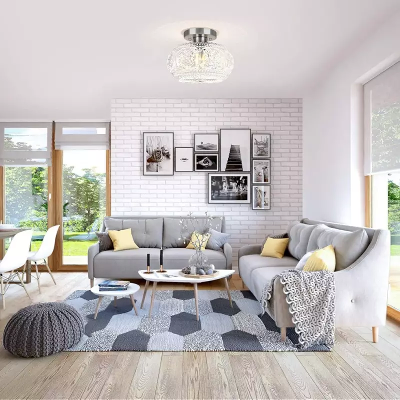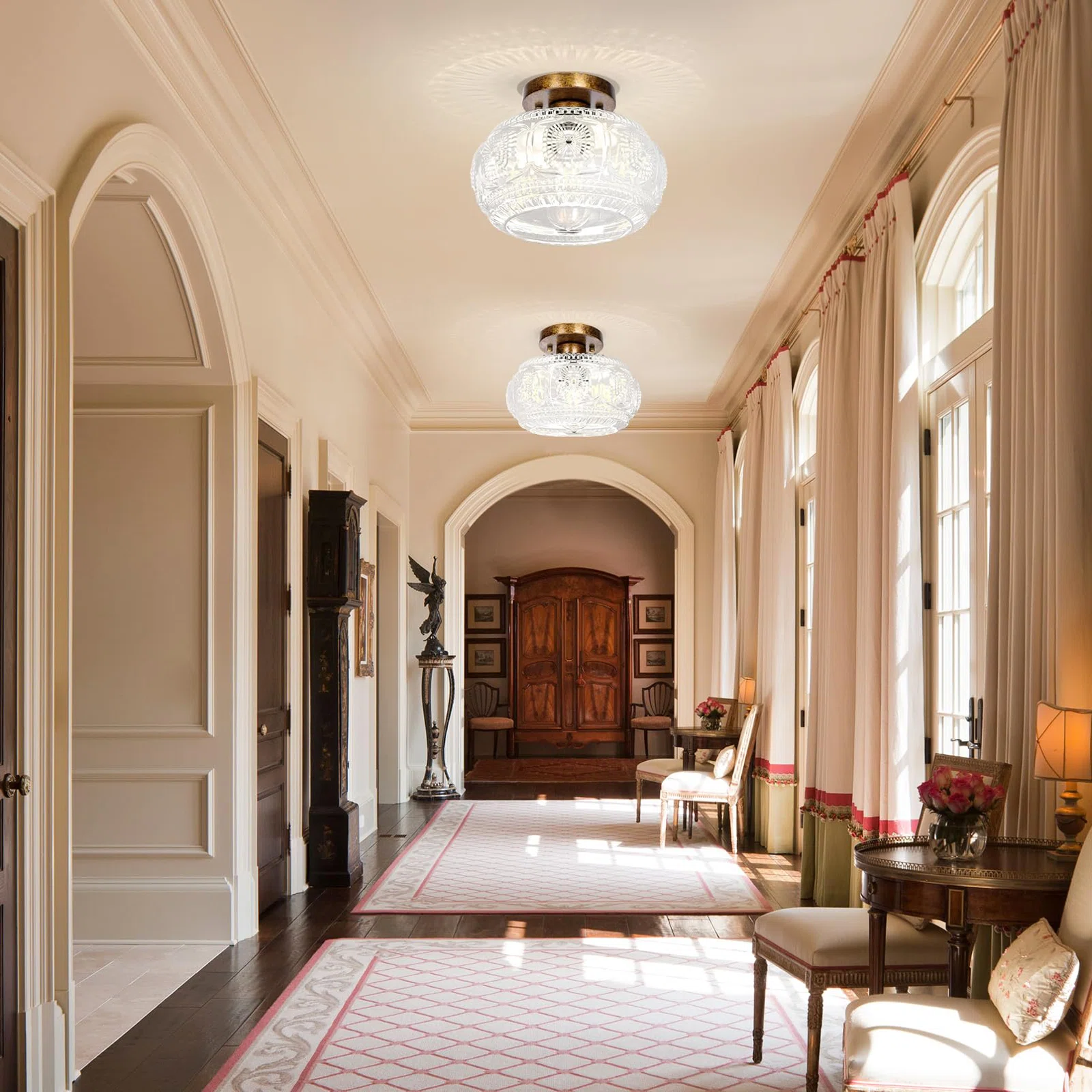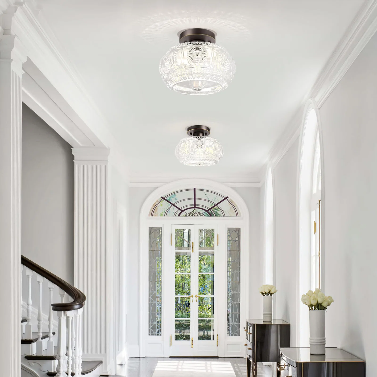 Farmhouse-styled ceiling light with engraved glass pattern, upgraded and larger semi-flush mount fixture crafted from clear glass, vintage aesthetic ideal for hallways, kitchens, bedrooms, and dining rooms.