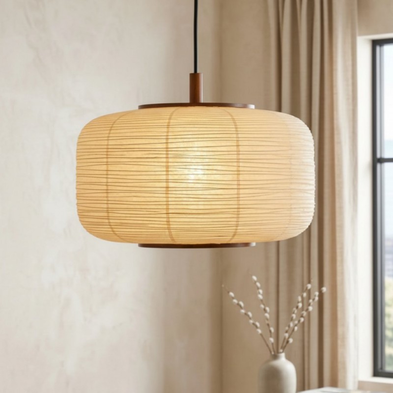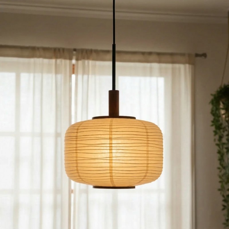 The Hanging Light Featuring a Japanese-Style Paper Lantern. Its delicate paper shade is inspired by traditional Japanese lanterns, adorned with ribbed detailing to add a touch of texture above your dining table. Available in two sizes to perfectly fit your space.