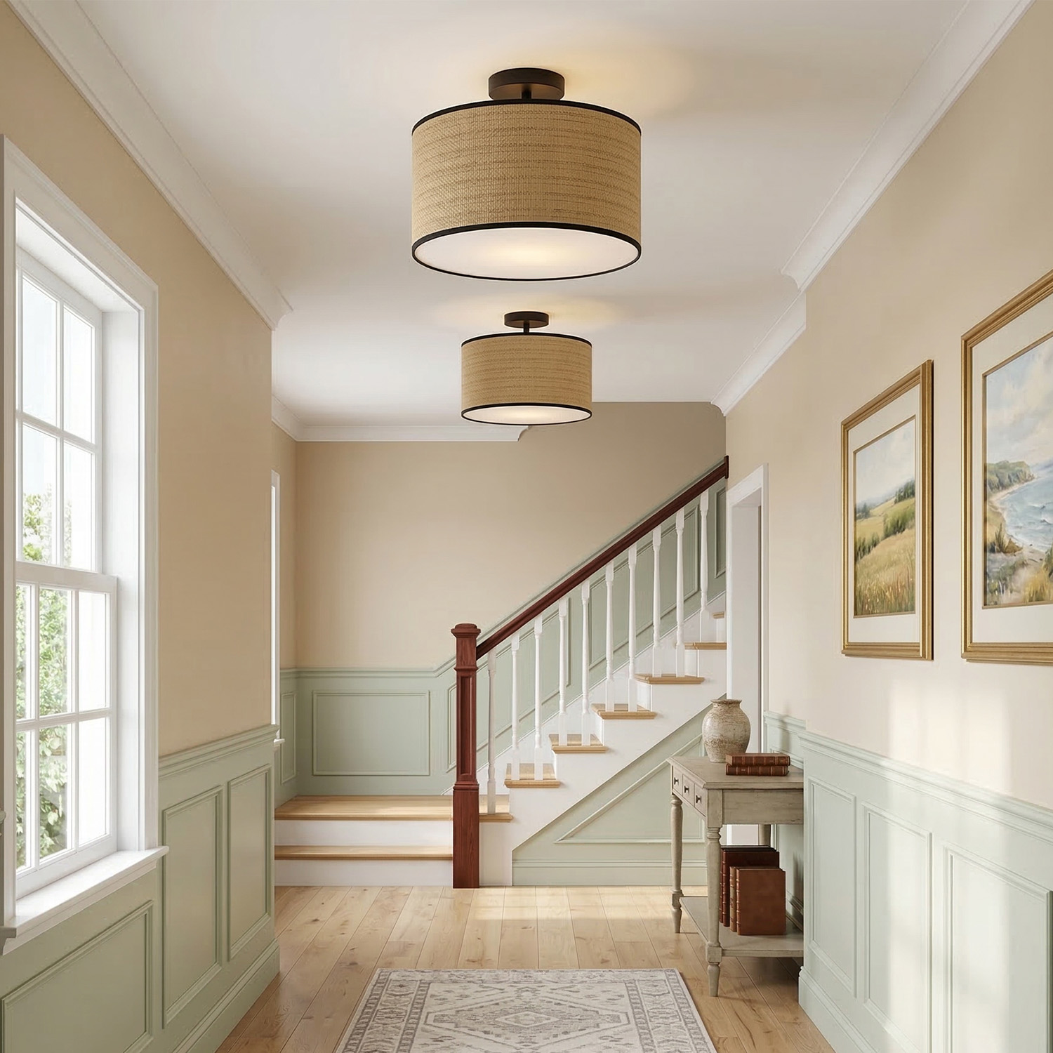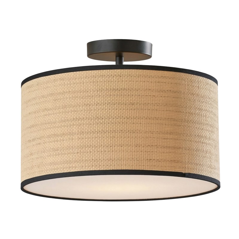 Brighten a living area or breakfast nook with the dimension and character of this modern coastal semi-flushmount ceiling light. The highlight is a natural, woven drum shade paired with an antique brass finish that adds a modern spin. A white fabric diffuser covers the bottom of the drum, ensuring soft, inviting illumination in a casual or coastal space.