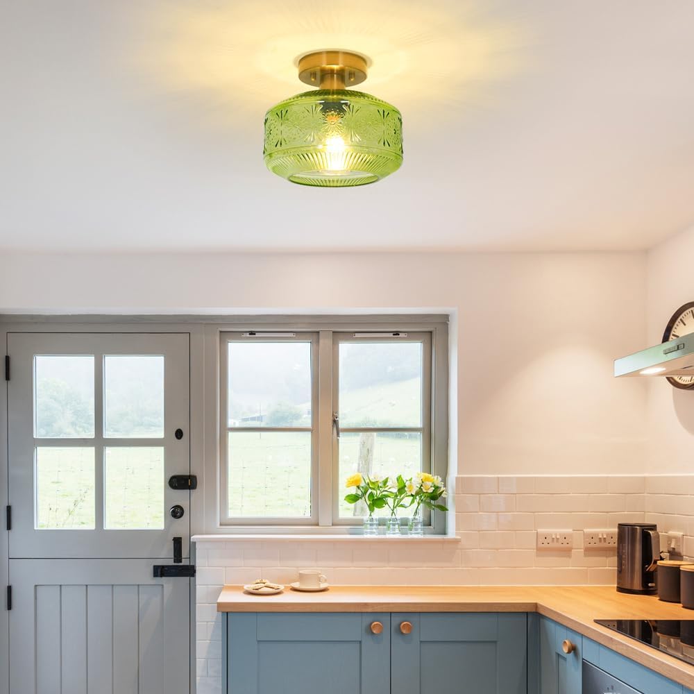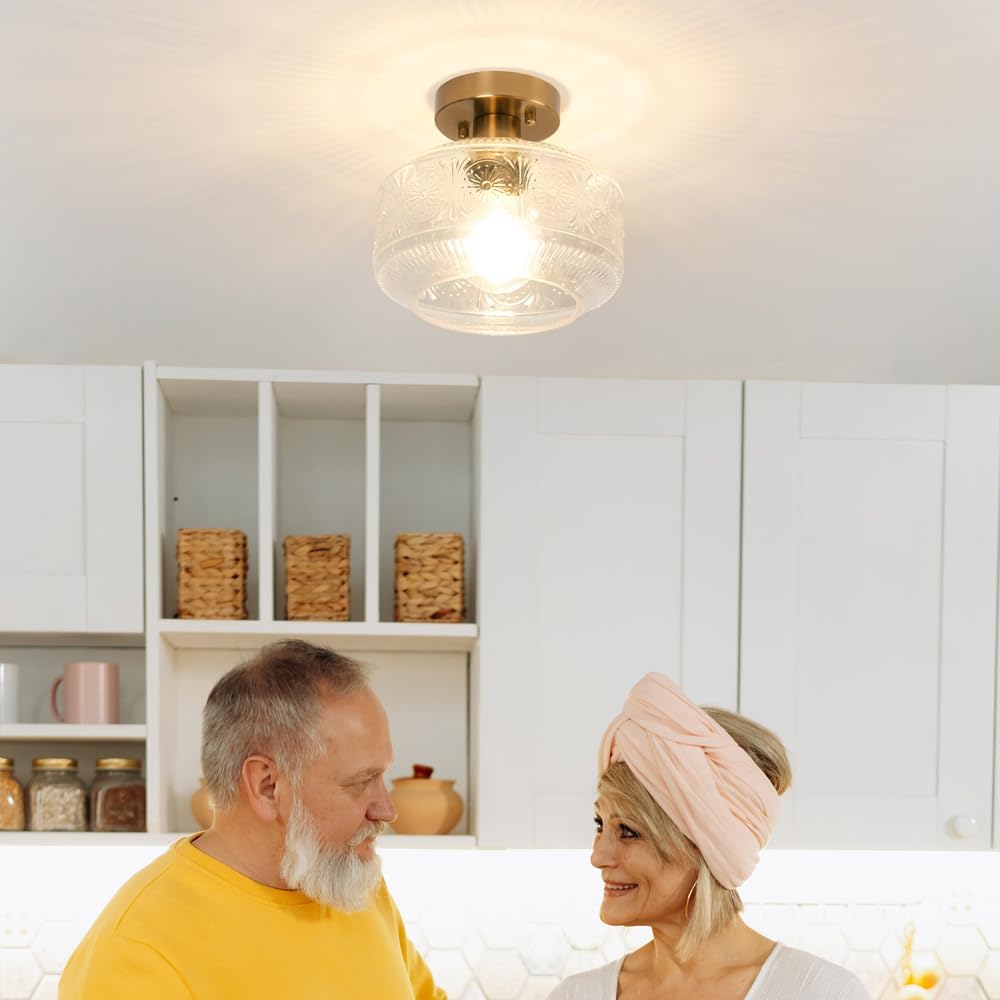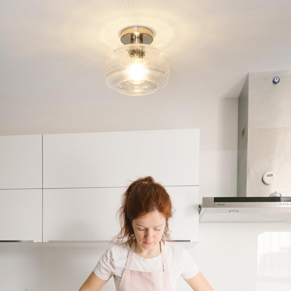 This semi flush mount ceiling light with an exclusive delicate clear glass shade on a vintage base is perfect for hallways, entrances, porches, utility rooms, stairwells, kitchens, closets, children's rooms, dining rooms, bedrooms, living rooms, and also for commercial venues: bars, cafes, hotels and restaurants!
