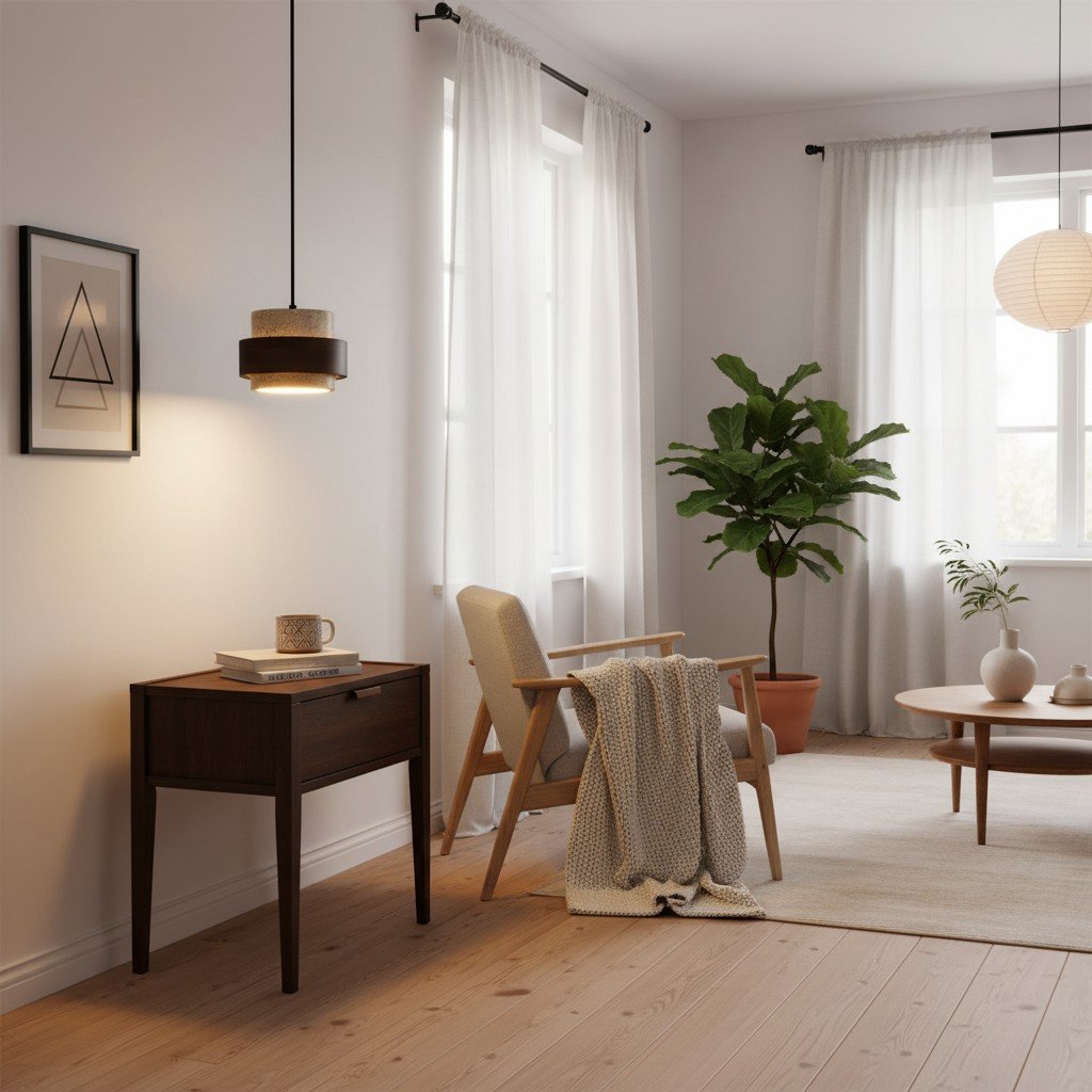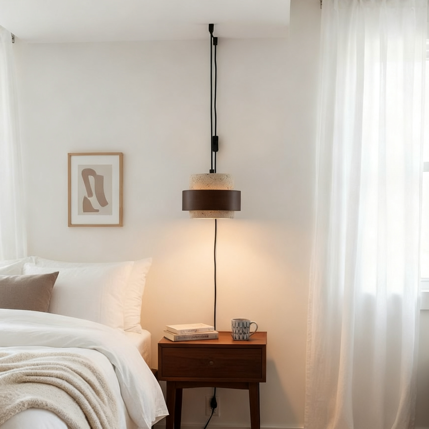 Crafted from travertine stone and encircled by a walnut wood, this pendant light with cylindrical shade casts a soft, ambient glow. Plug-in design for easy installation. Perfect for rustic-modern, industrial, or Scandinavian interiors. Ideal for entryways, dining areas, or intimate living spaces.