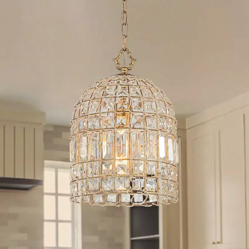 Classic and elegant, this three-headed crystal chandelier features a birdcage-like metal frame inlaid with crystal beads. Brilliant-cut crystals are set between the grids of the lantern-style shade, maximizing the refraction and reflection of light. Hundreds of hand-strung clear glass beads adorn the frame, creating a chill winter vibe.