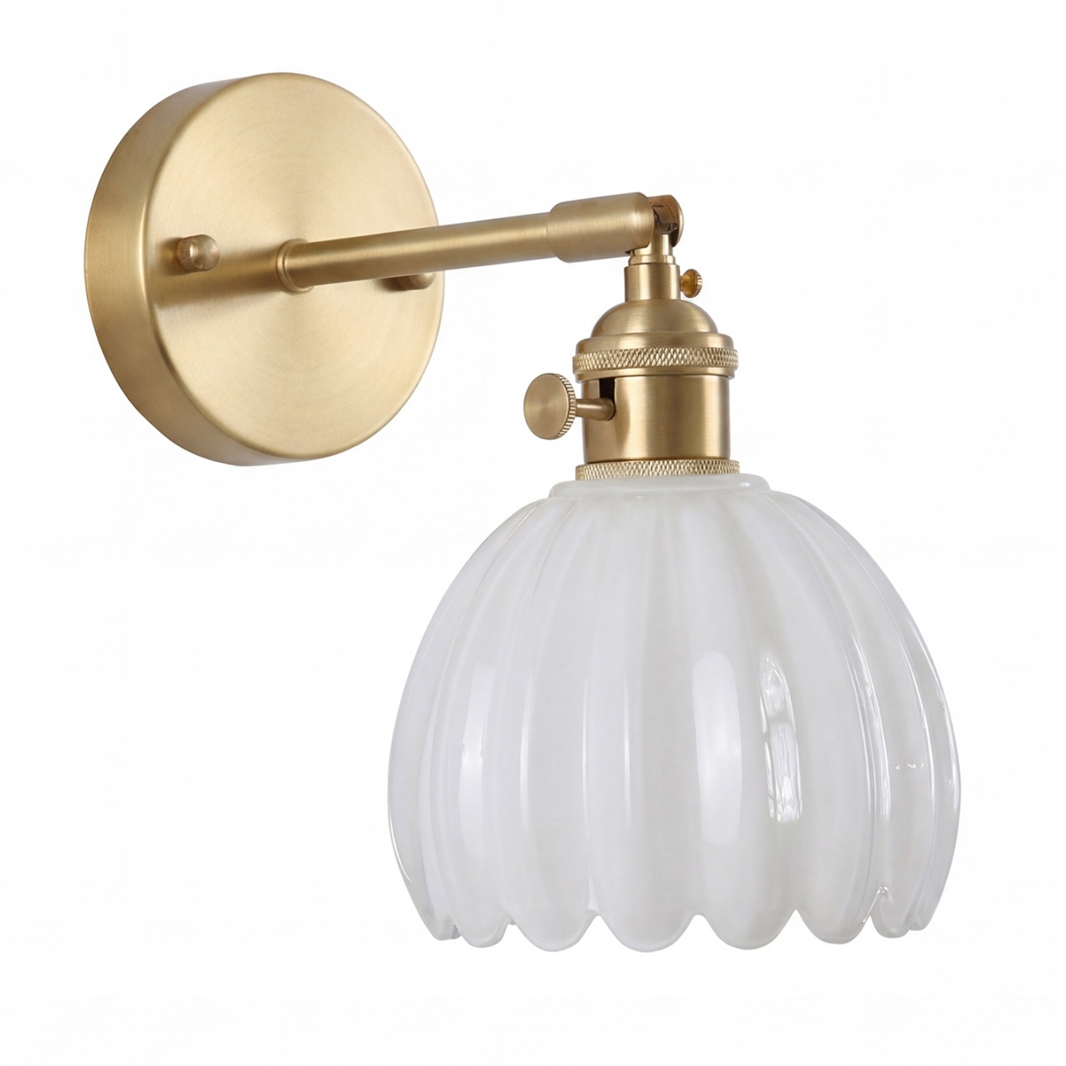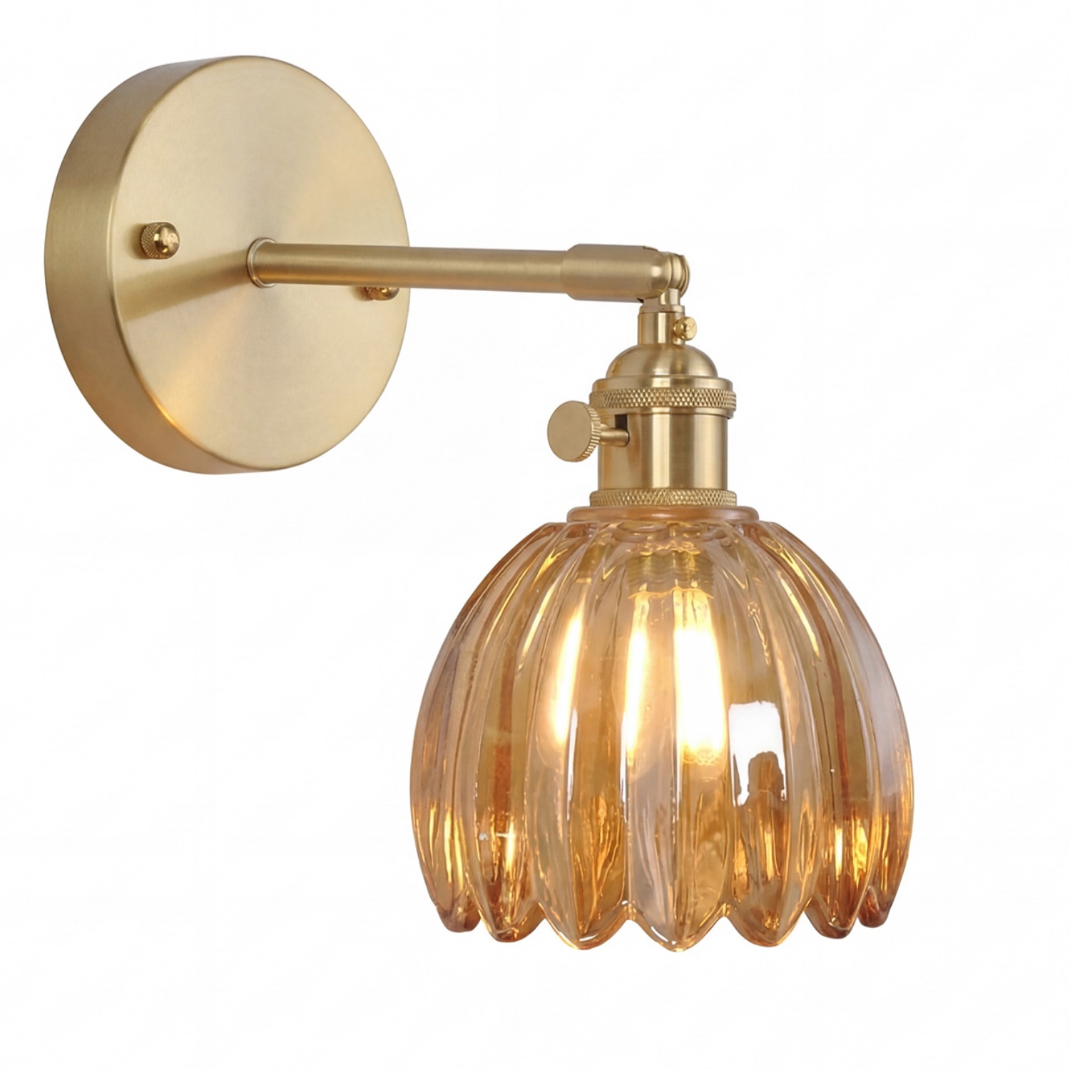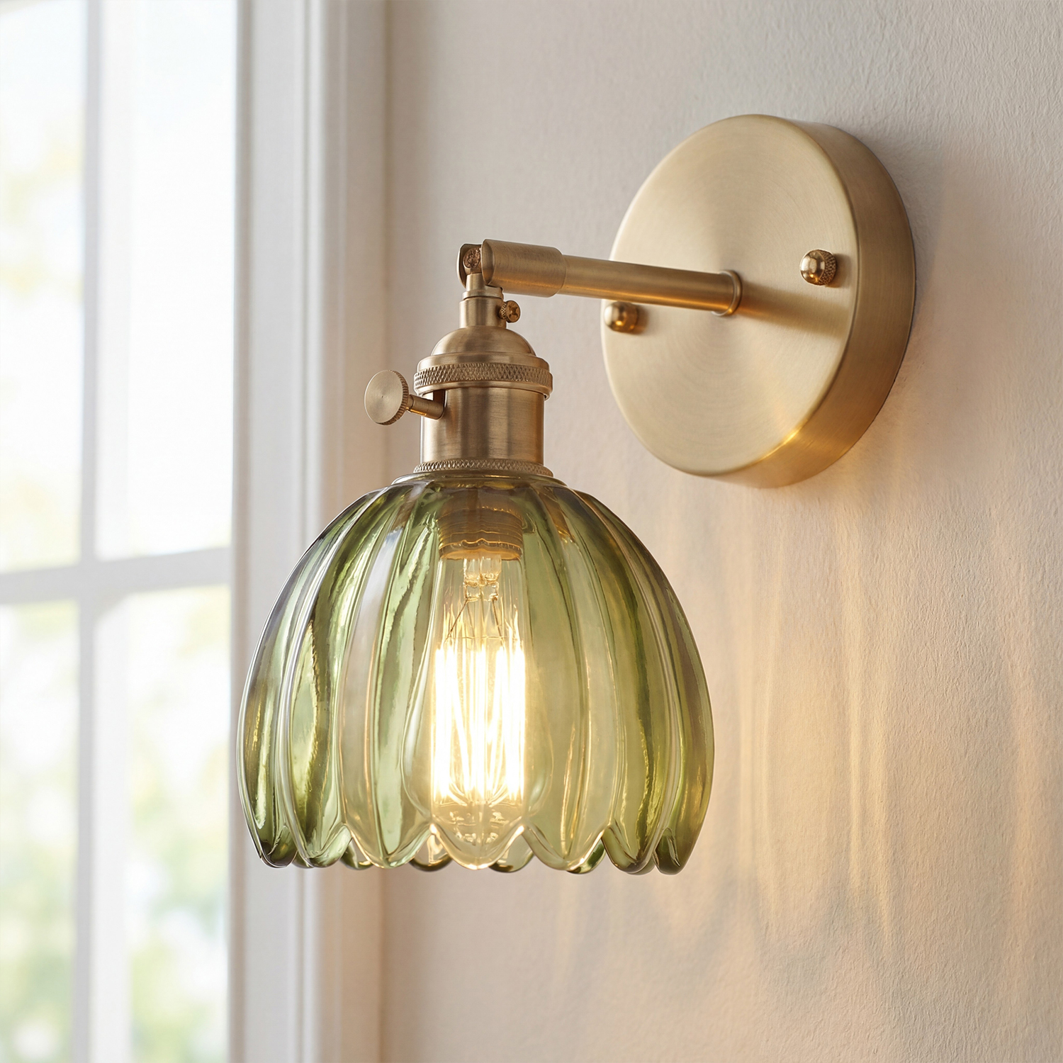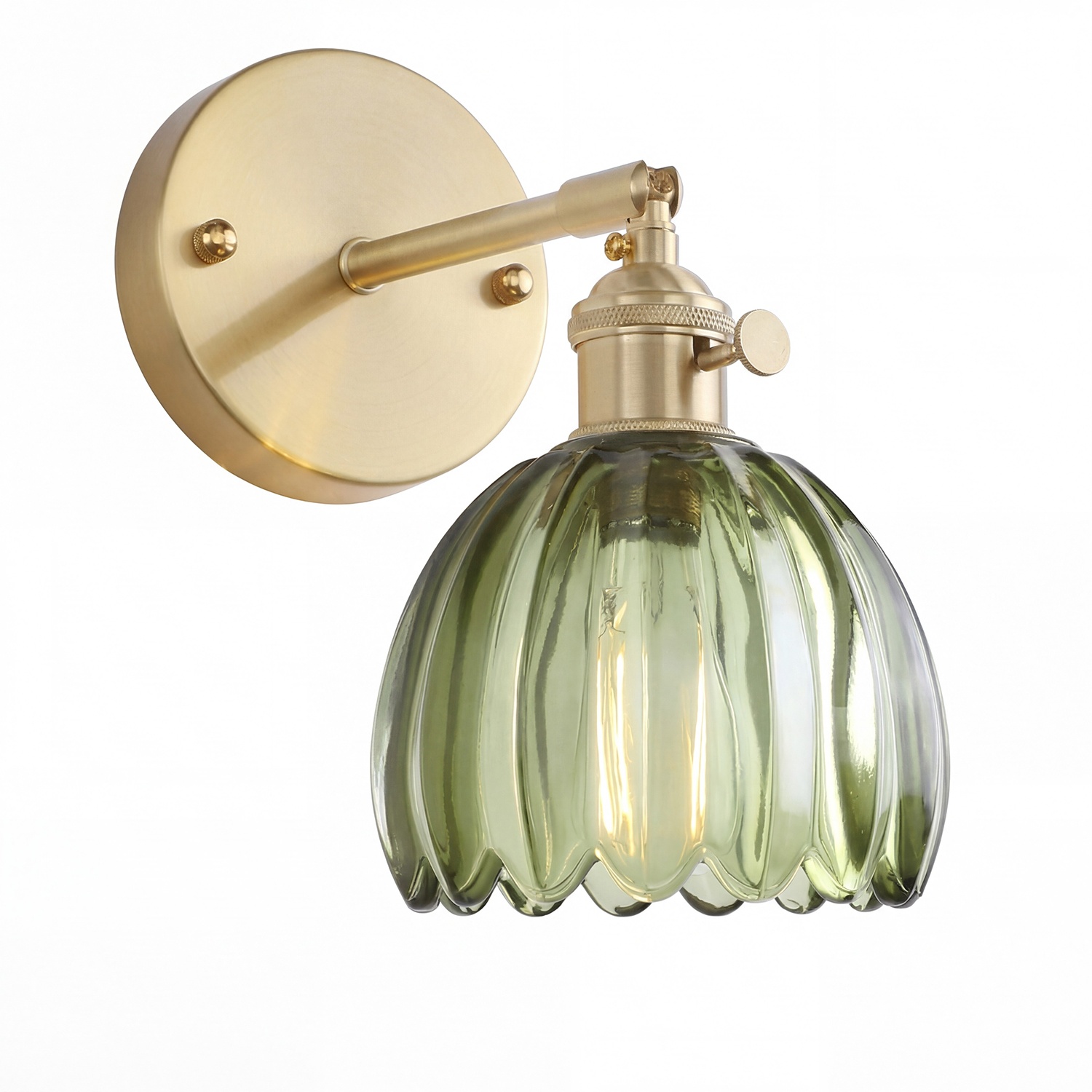 This wall sconce uses a delicate tulip shade with a copper base that exudes rustic charm, six shades of translucent shade options that exude a unique and whimsical glow, and its adjustable head allows for personalized illumination, no matter what angle it's at.