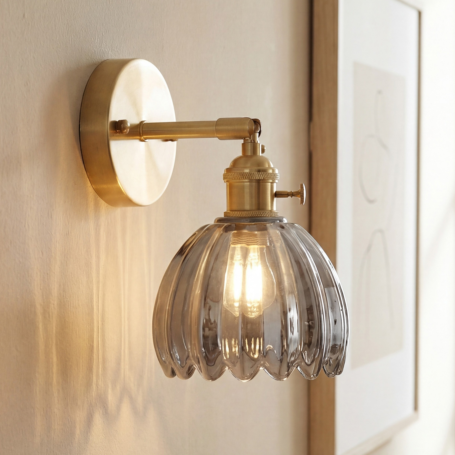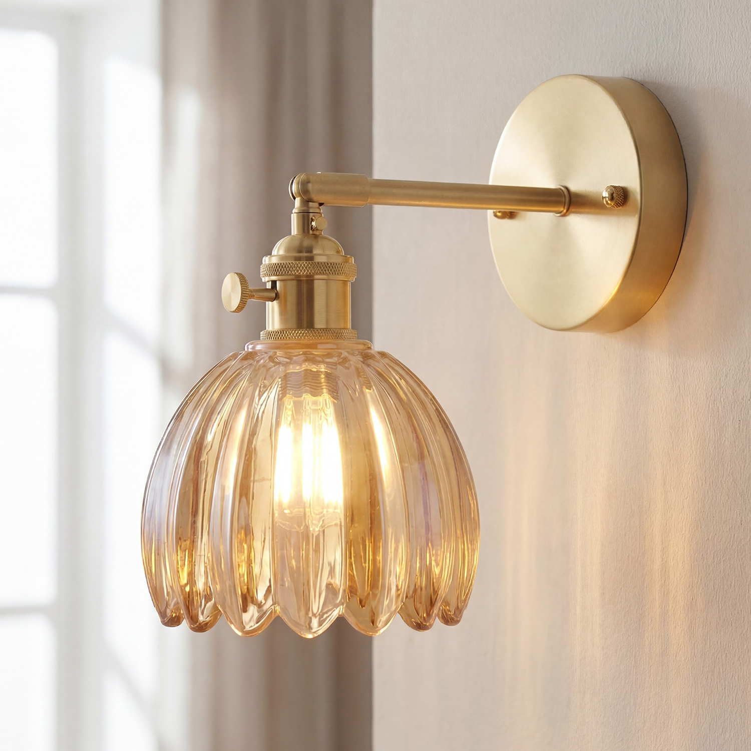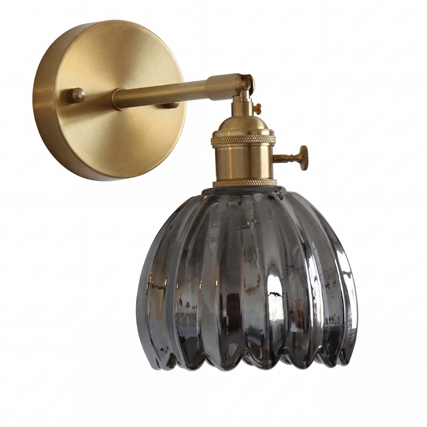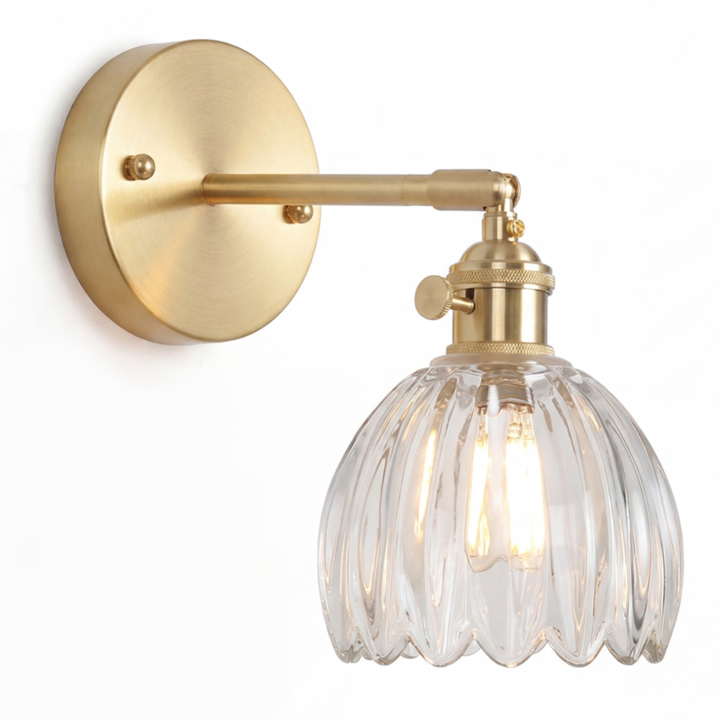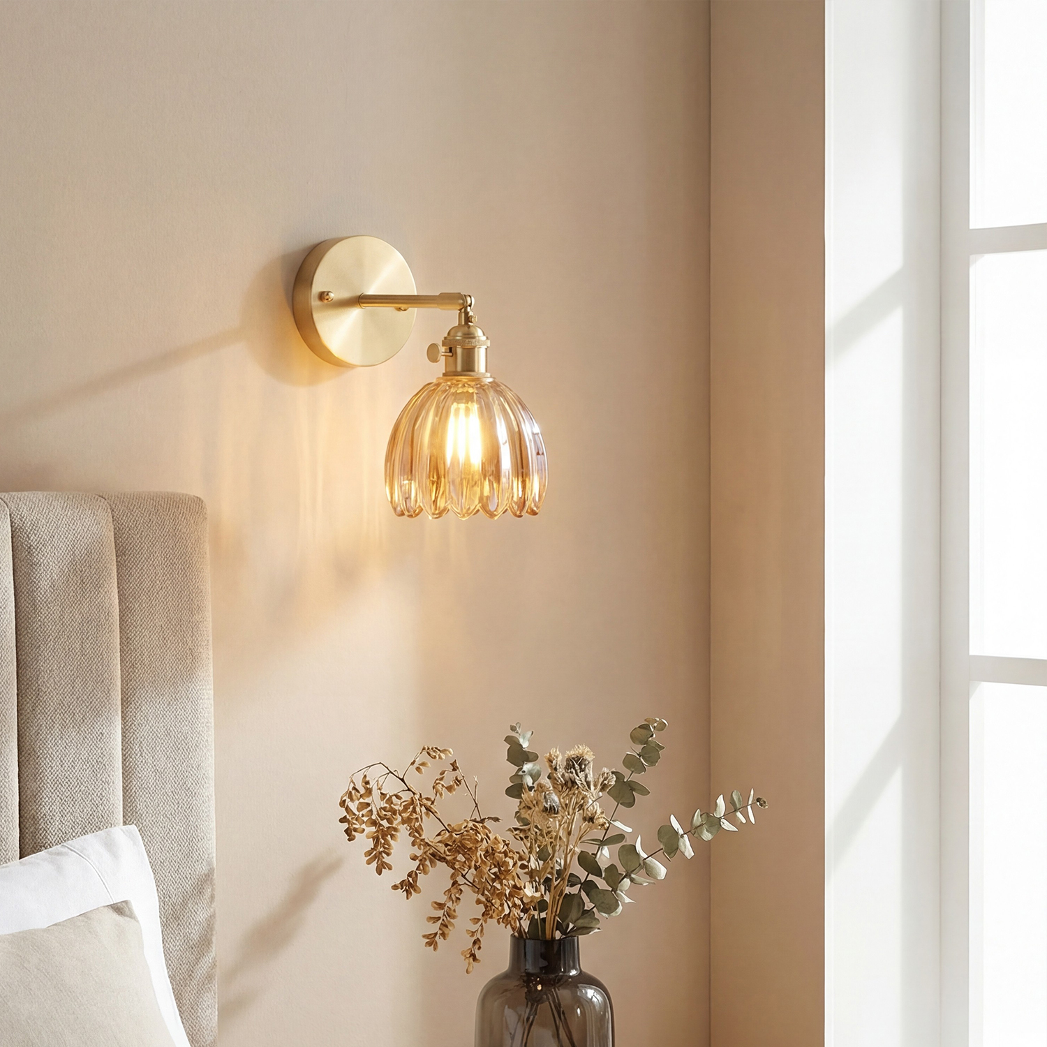 This wall sconce uses a delicate tulip shade with a copper base that exudes rustic charm, six shades of translucent shade options that exude a unique and whimsical glow, and its adjustable head allows for personalized illumination, no matter what angle it's at.
