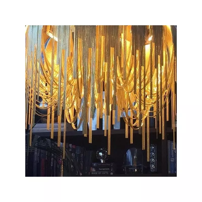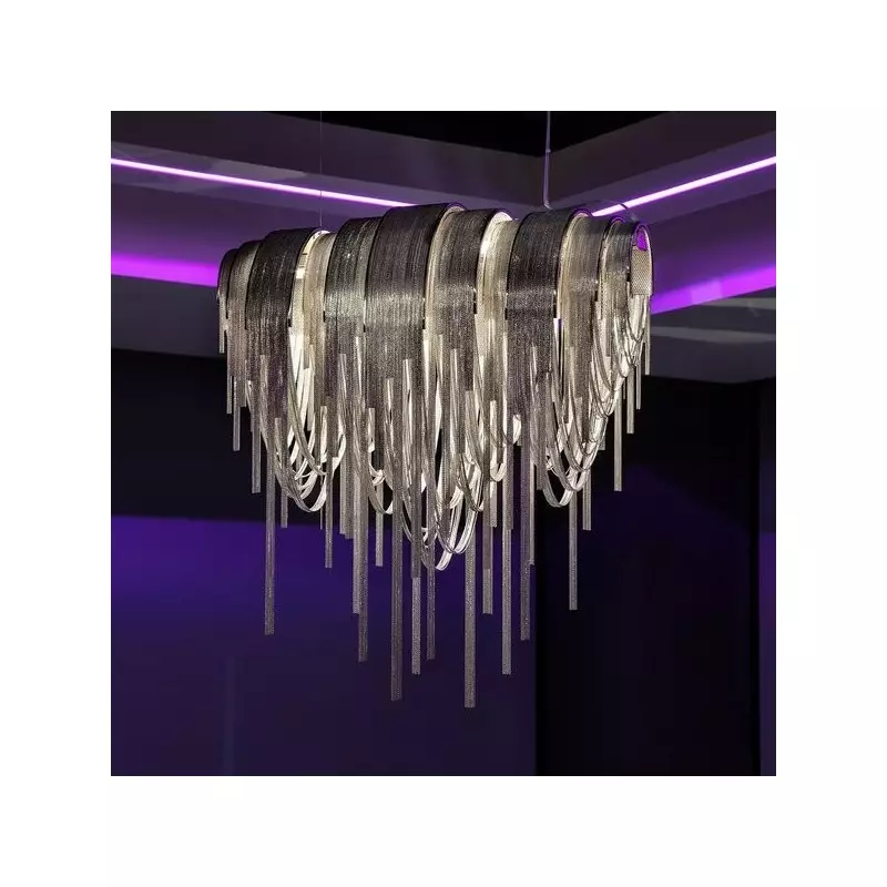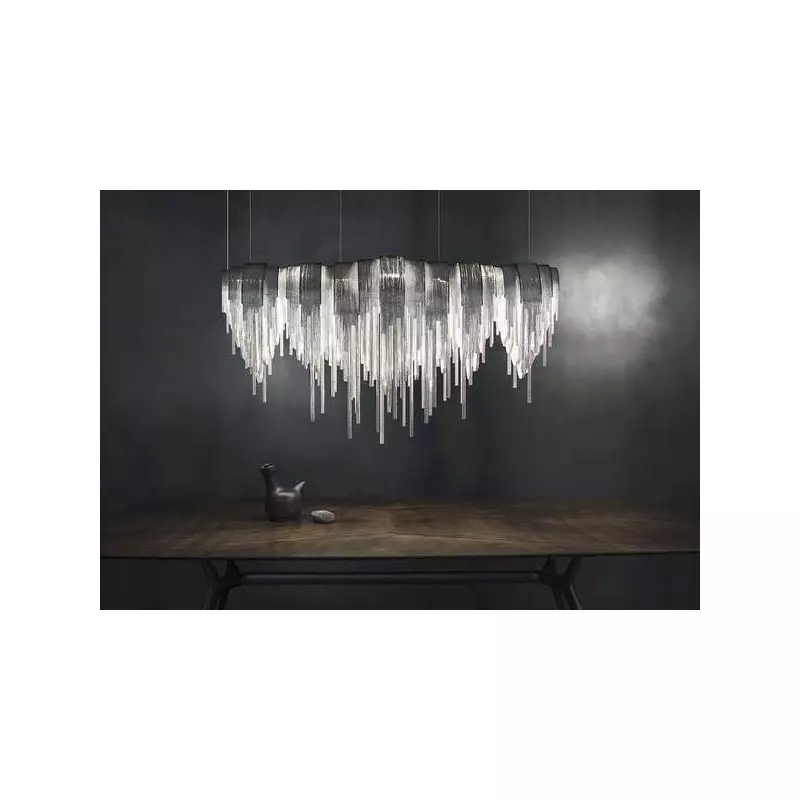 - A resplendent mass of burnished cascading fluidity, Volver LED Linear Suspension emphatically elevates the extravagance, melding the company's aesthetic affinity for elegantly draped metal chain fixtures with energy efficient LED technology. Elaborate elongated lengths of nickel-plated chains lavishly drape and loop around a hollowed central frame that houses the LEDs, creating a ceaseless contemporary sparkle for a new level of luxury. This geometric design combines thin nickel chains with the latest in LED technology to create a light that is both elegant and modern. A breath of new light, Volver melds technology and art to achieve a new level of luxury. Please note: Your payment does not include customs duties, local taxes or any other import costs. If you have any questions about our products, please contact us and we will get back to you within 24 hours.