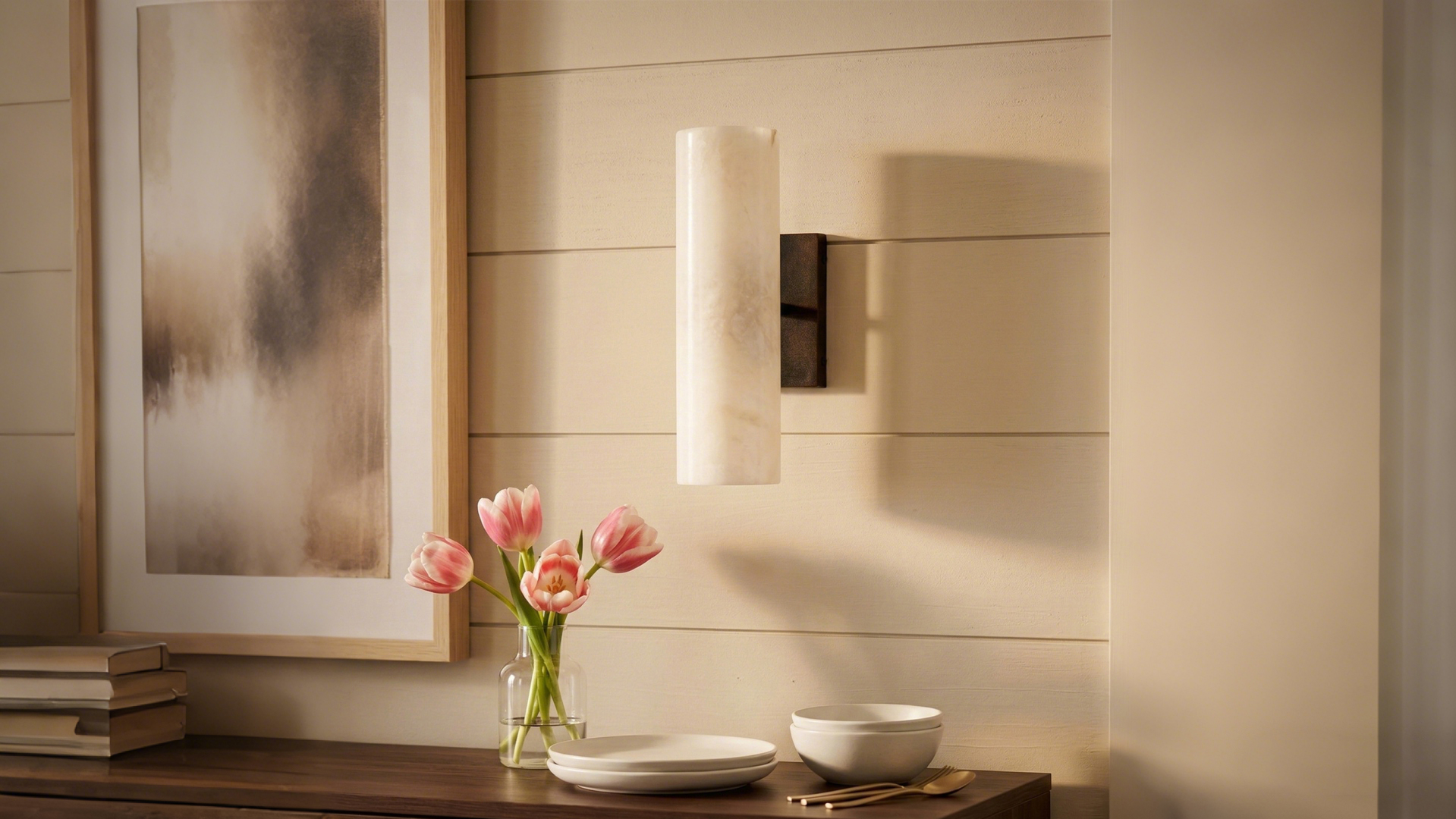 This modern, minimalist Alabaster Tube Wall Sconce features a sleek industrial style and a warm alabaster glow. Durable and versatile, it can be mounted vertically or horizontally to fit your space.