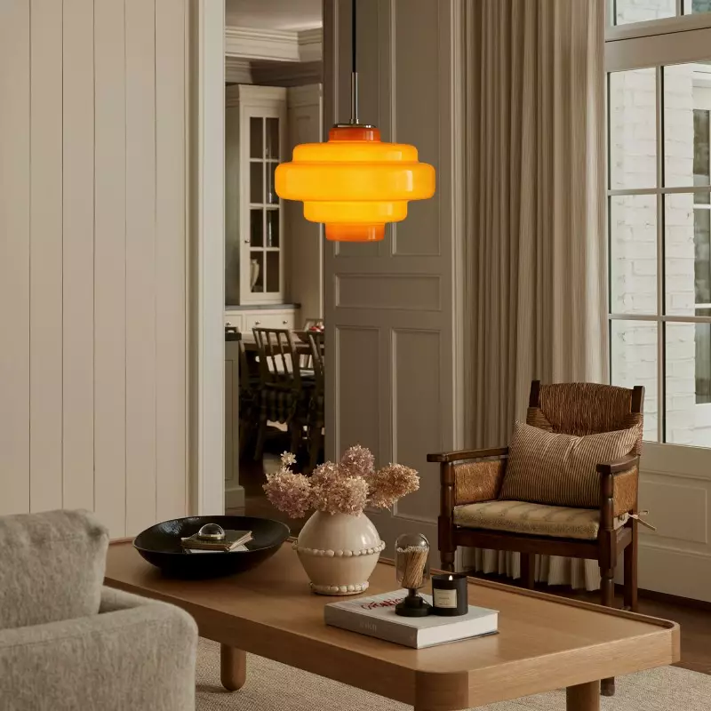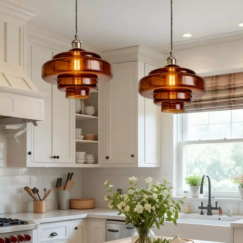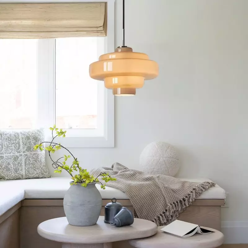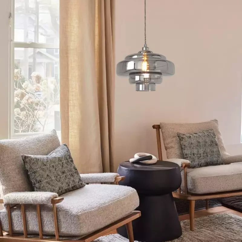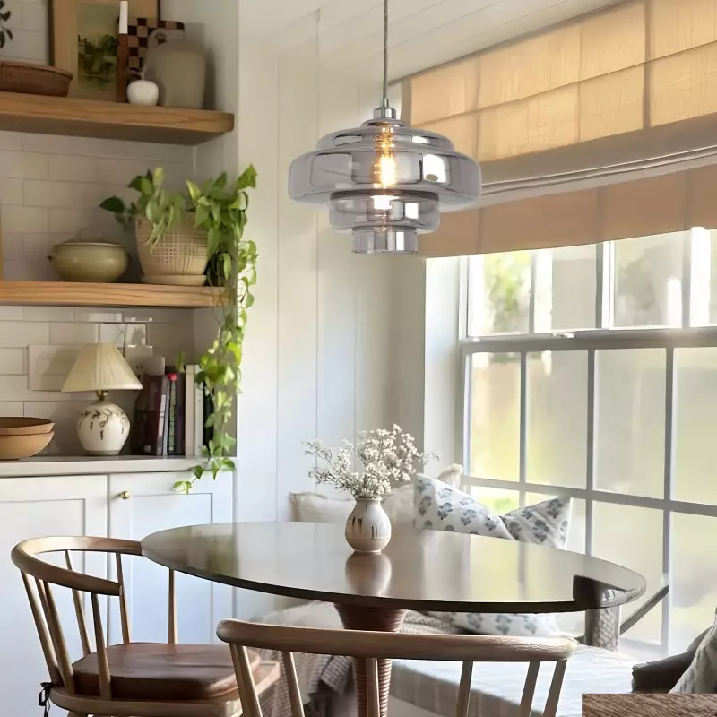 This vintage tiered glass pendant light combines retro charm with modern design. Featuring multiple glass layers in colors like amber, green, and smoke grey, it provides soft illumination for kitchen islands, dining rooms, and living areas. Perfect for adding style and warmth to any space.