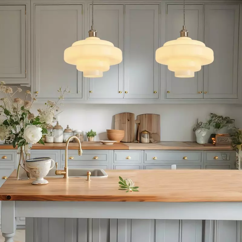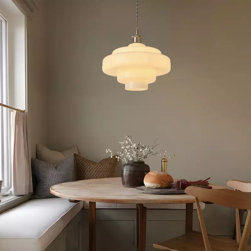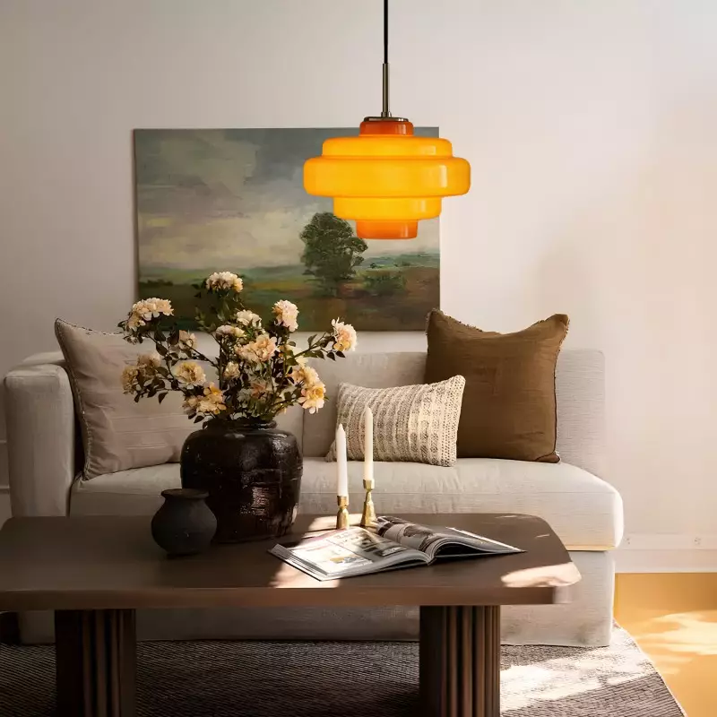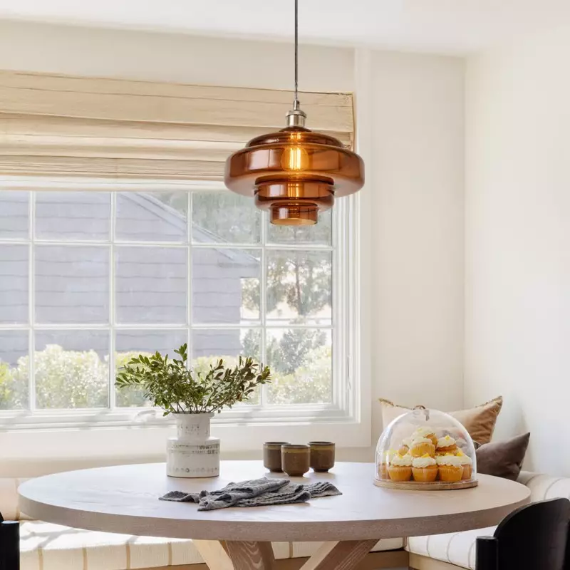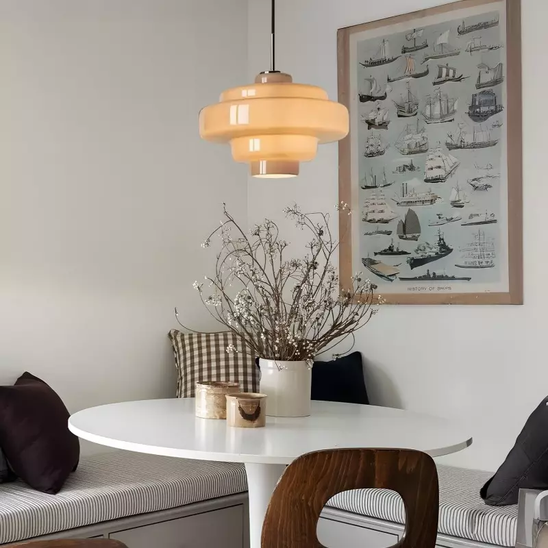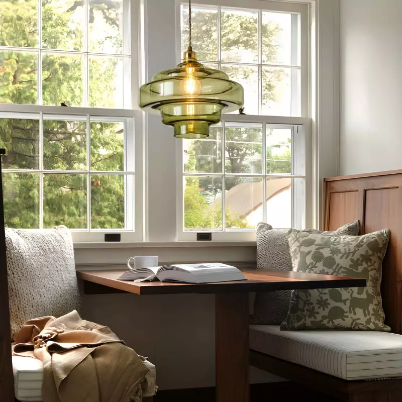 This vintage tiered glass pendant light combines retro charm with modern design. Featuring multiple glass layers in colors like amber, green, and smoke grey, it provides soft illumination for kitchen islands, dining rooms, and living areas. Perfect for adding style and warmth to any space.